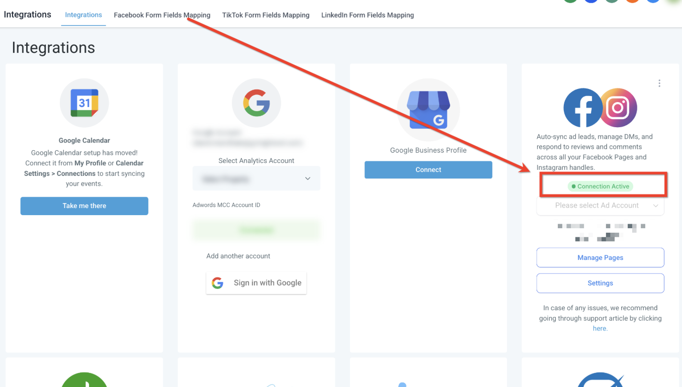 Ubica la tarjeta de Facebook–Instagram en la parte superior derecha de la pantalla de Integraciones y haz clic en Conectar o "connect".