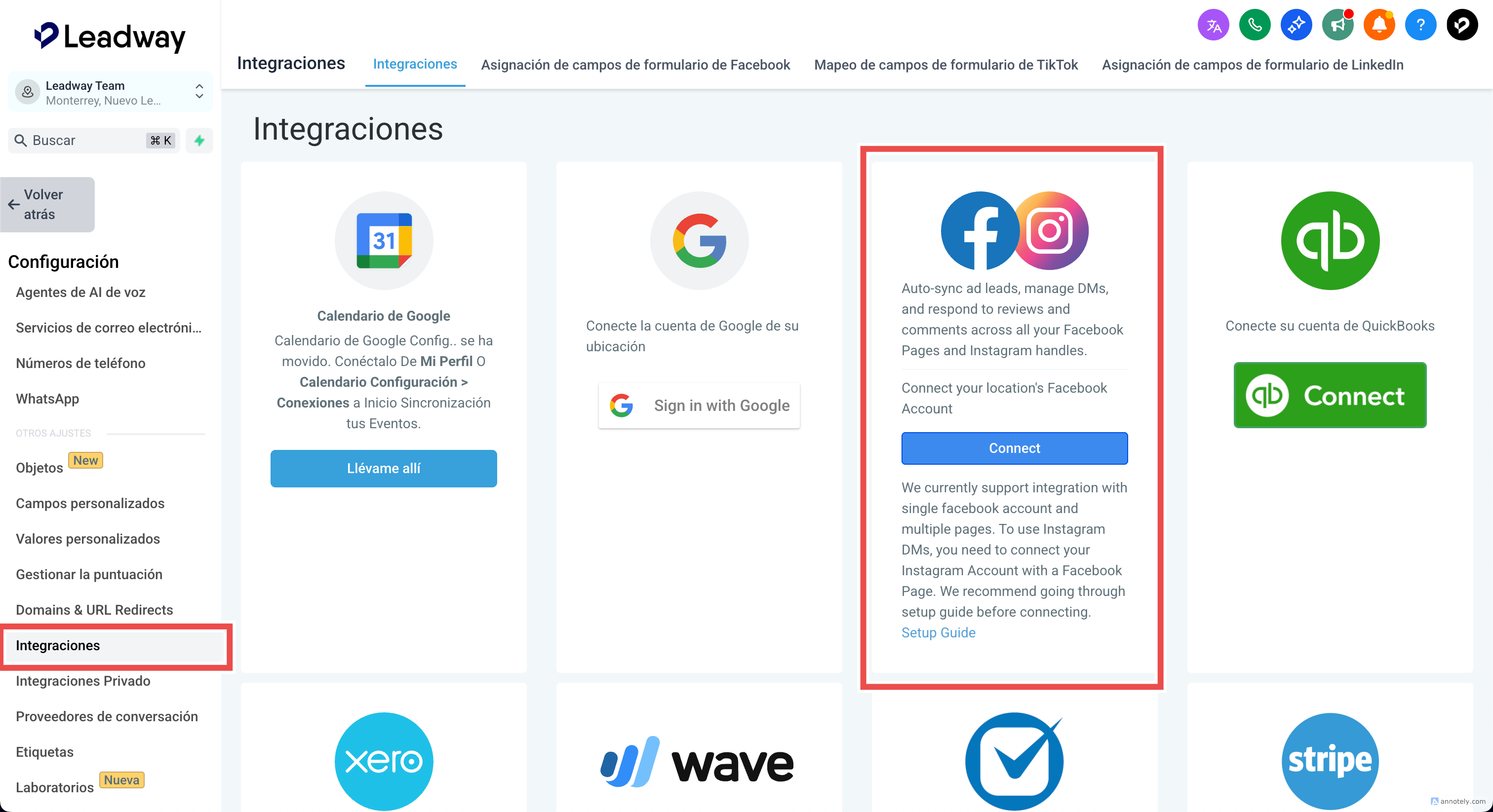 La integración con Facebook te permite conectar tu Página de Facebook Business y sincronizar los leads directamente en una subcuenta de Leadway. Esta conexión admite Lead Ads creados mediante Formularios Instantáneos de Facebook y habilita potentes automatizaciones utilizando Workflows de Leadway.