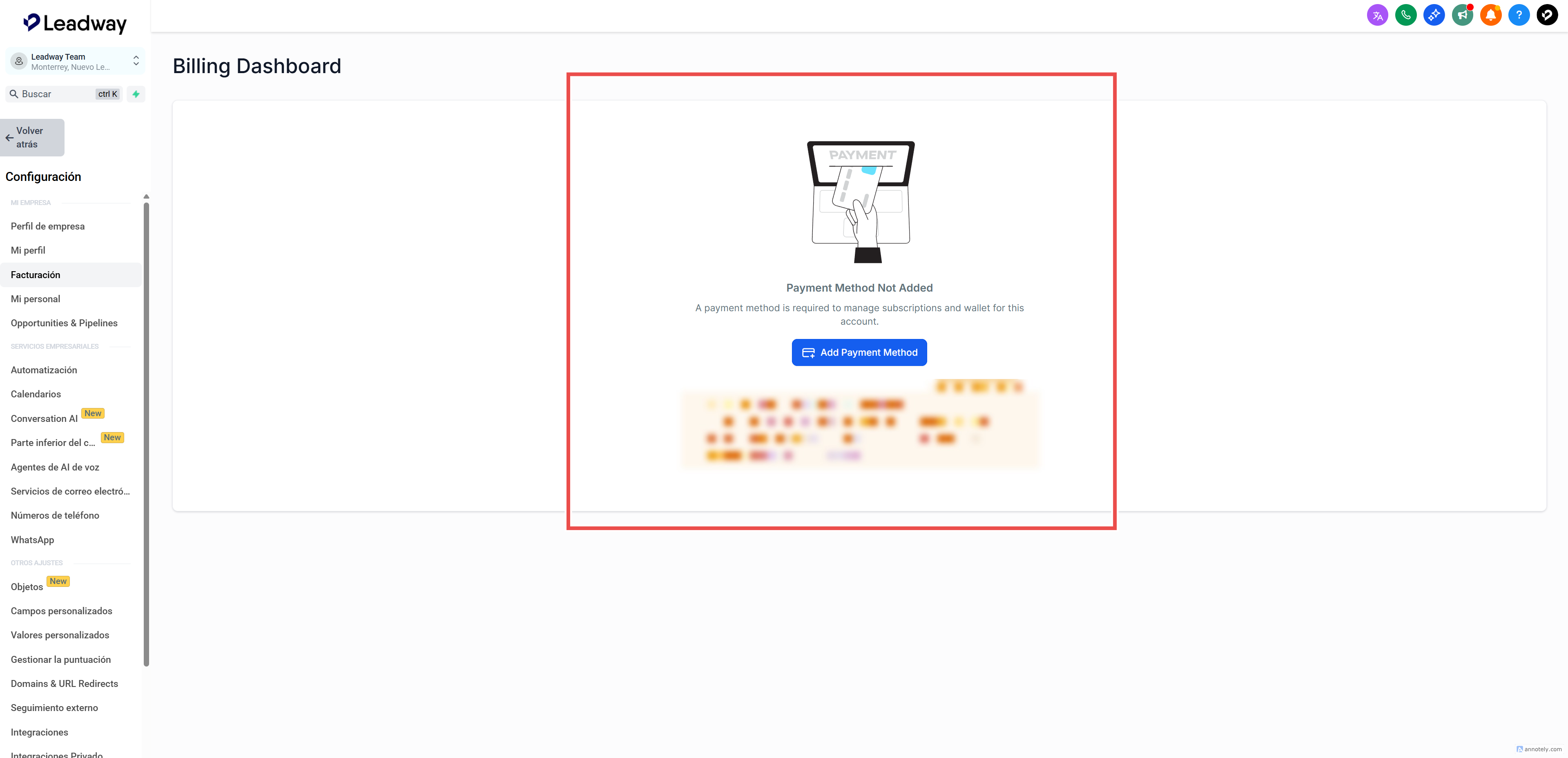 En esta guía aprenderás cómo agregar o actualizar tu método de pago para el cobro de tu plan, servicios adicionales o cargos relacionados con la plataforma, como el uso de WhatsApp, correo electrónico, telefonía u otros.