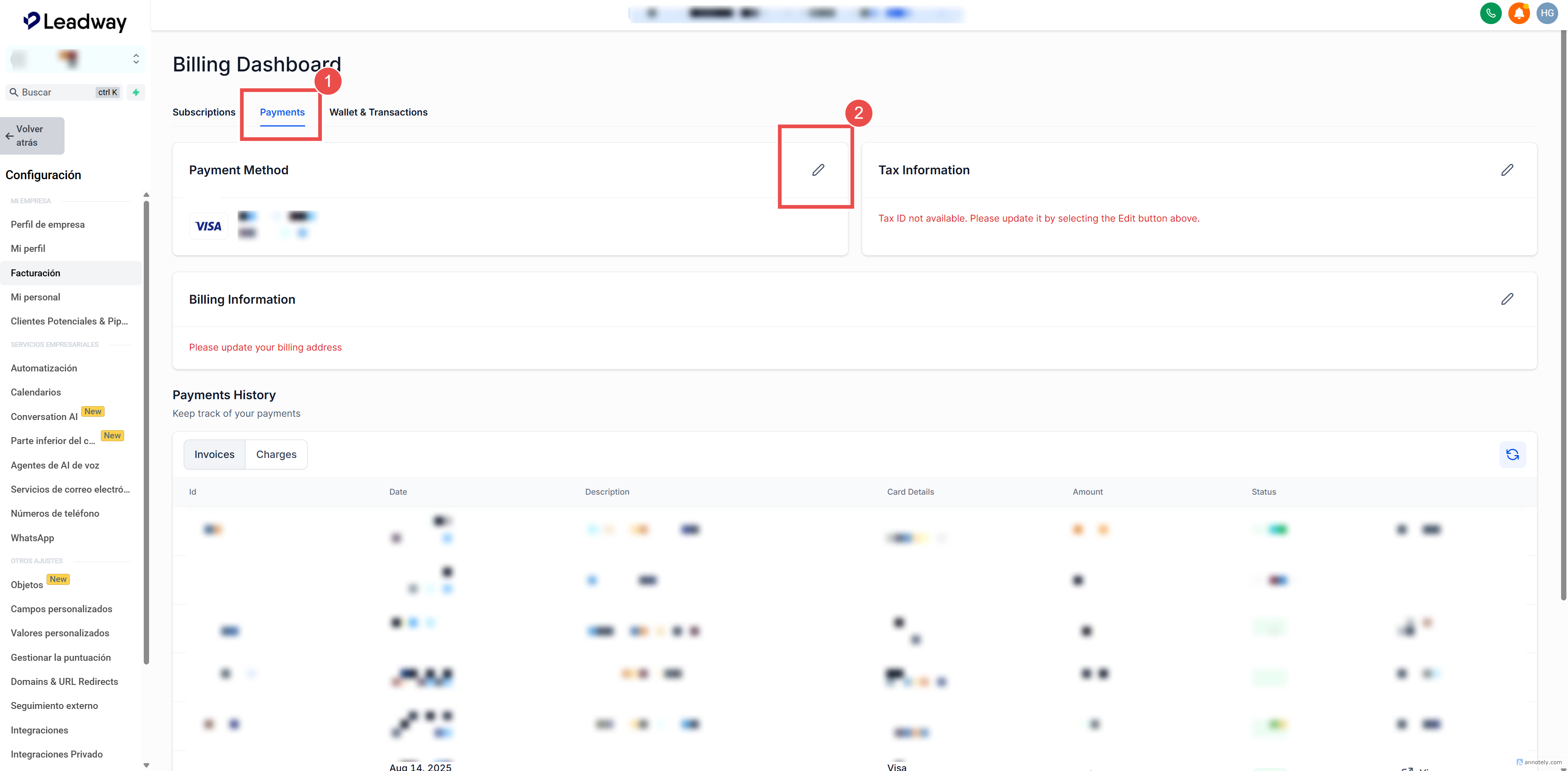 Ingresa a "payments" o “pagos” y haz clic en el icono de lápiz para actualizar tu método de pago