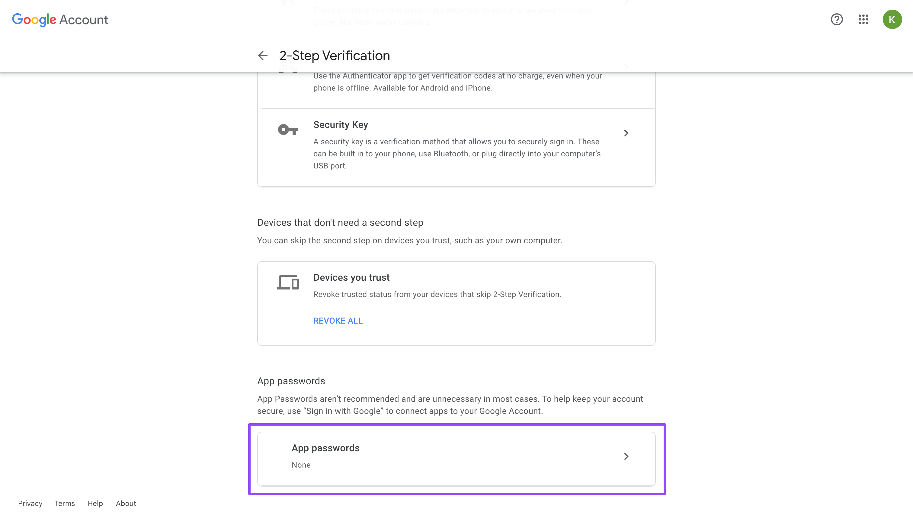 En la siguiente pantalla, desplázate hasta la parte inferior de la página y haz clic en Contraseñas de aplicaciones.