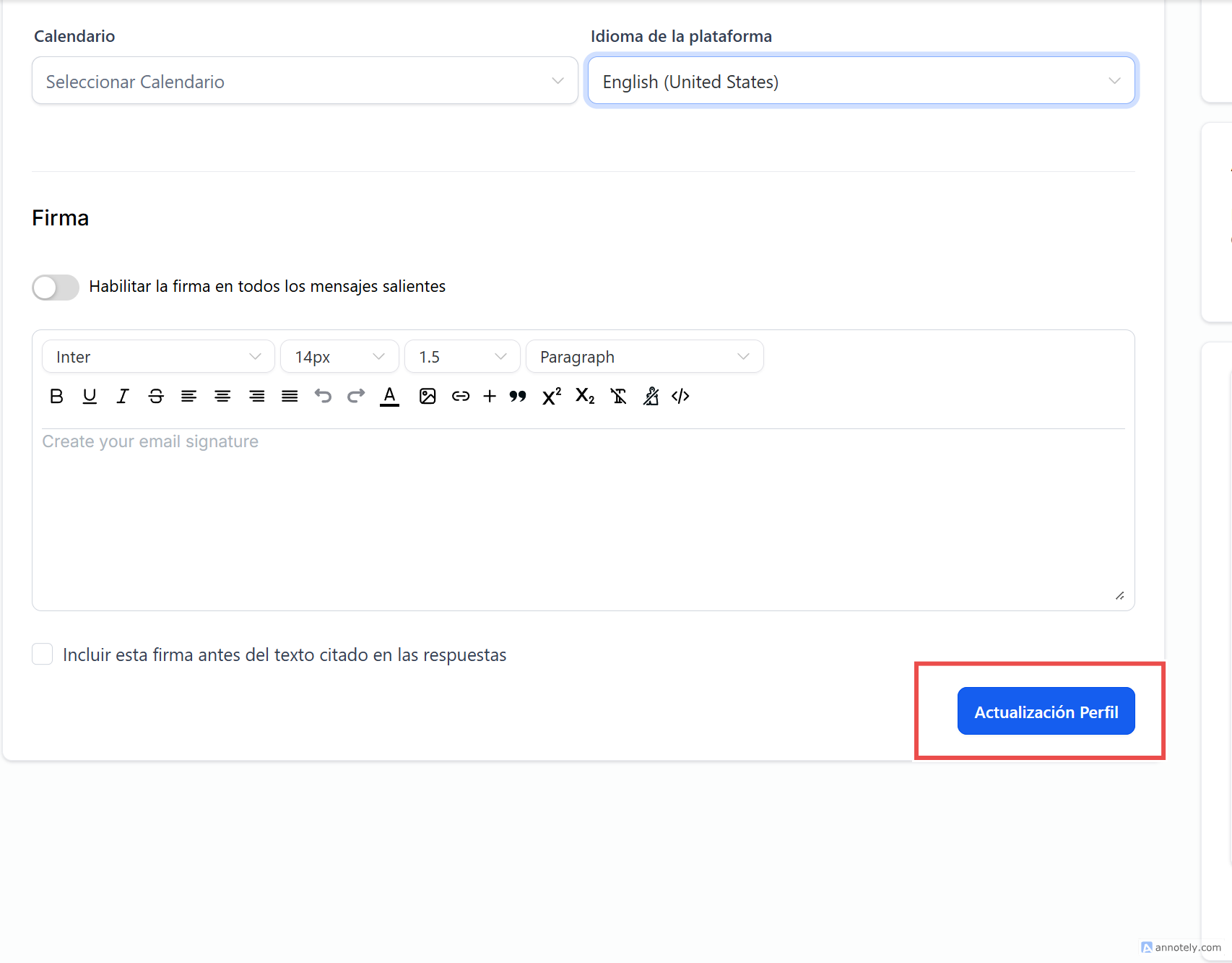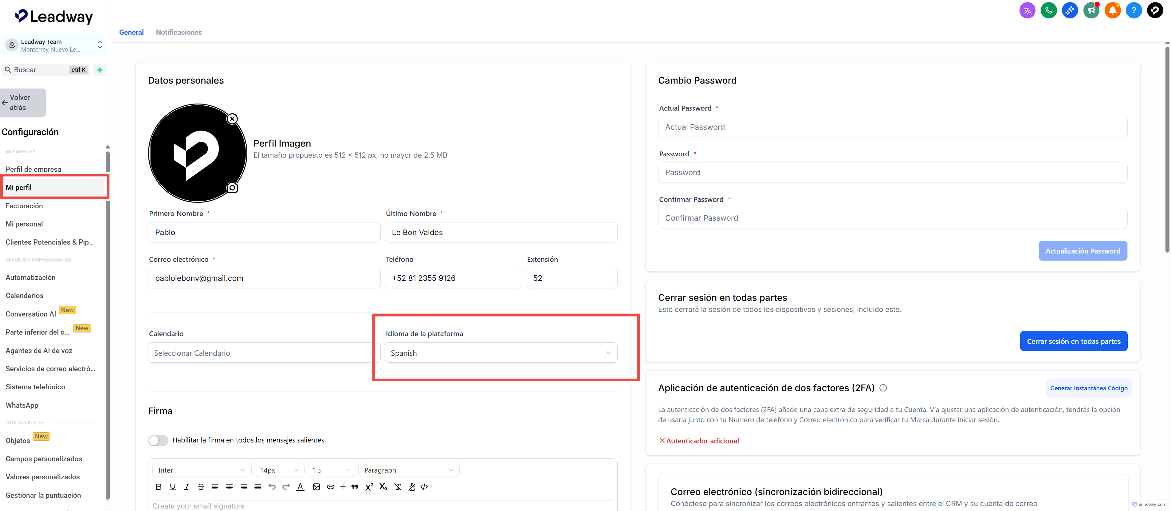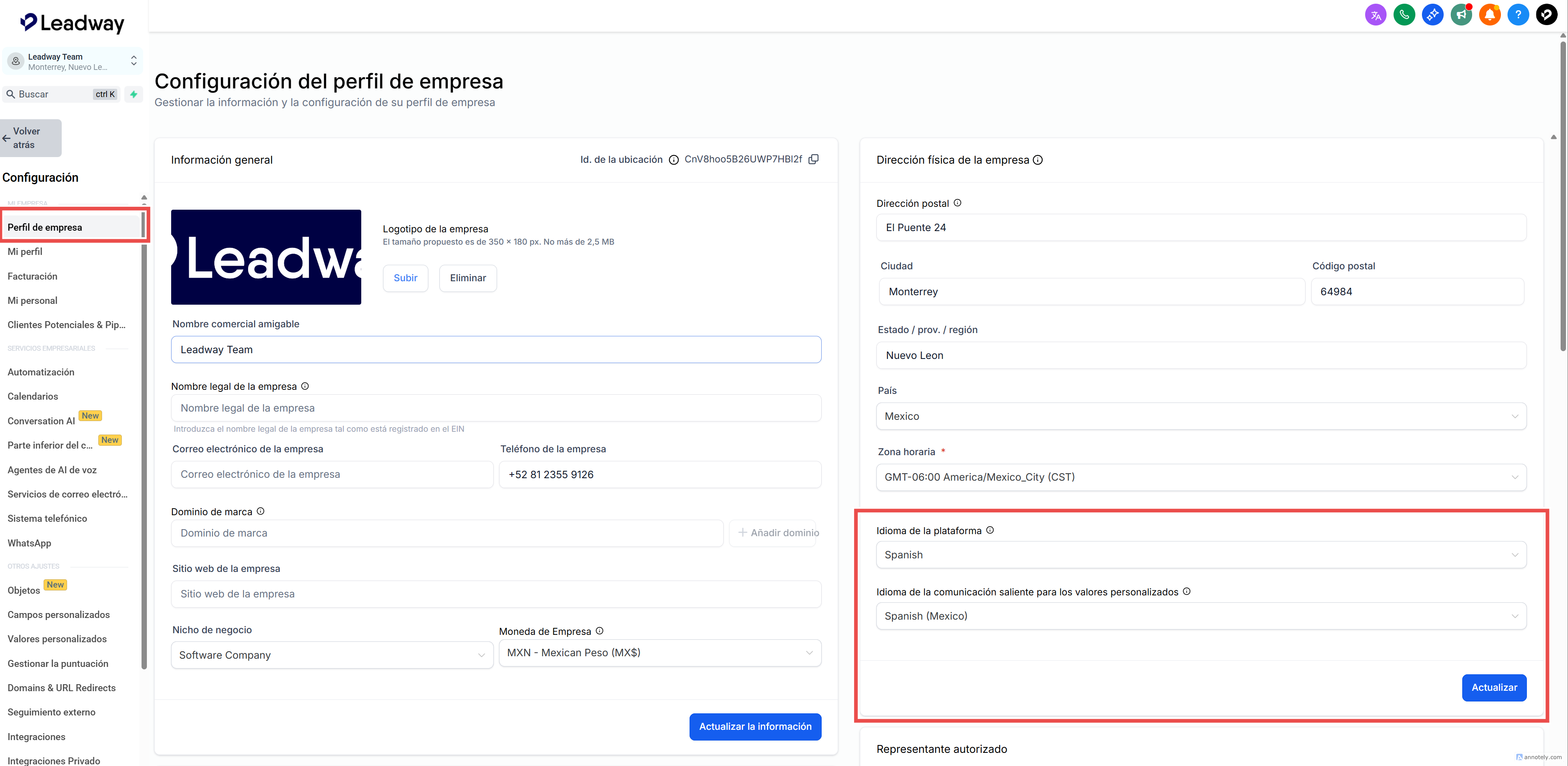 Ingresa a configuracion > perfil de empresa > idioma de la plataforma