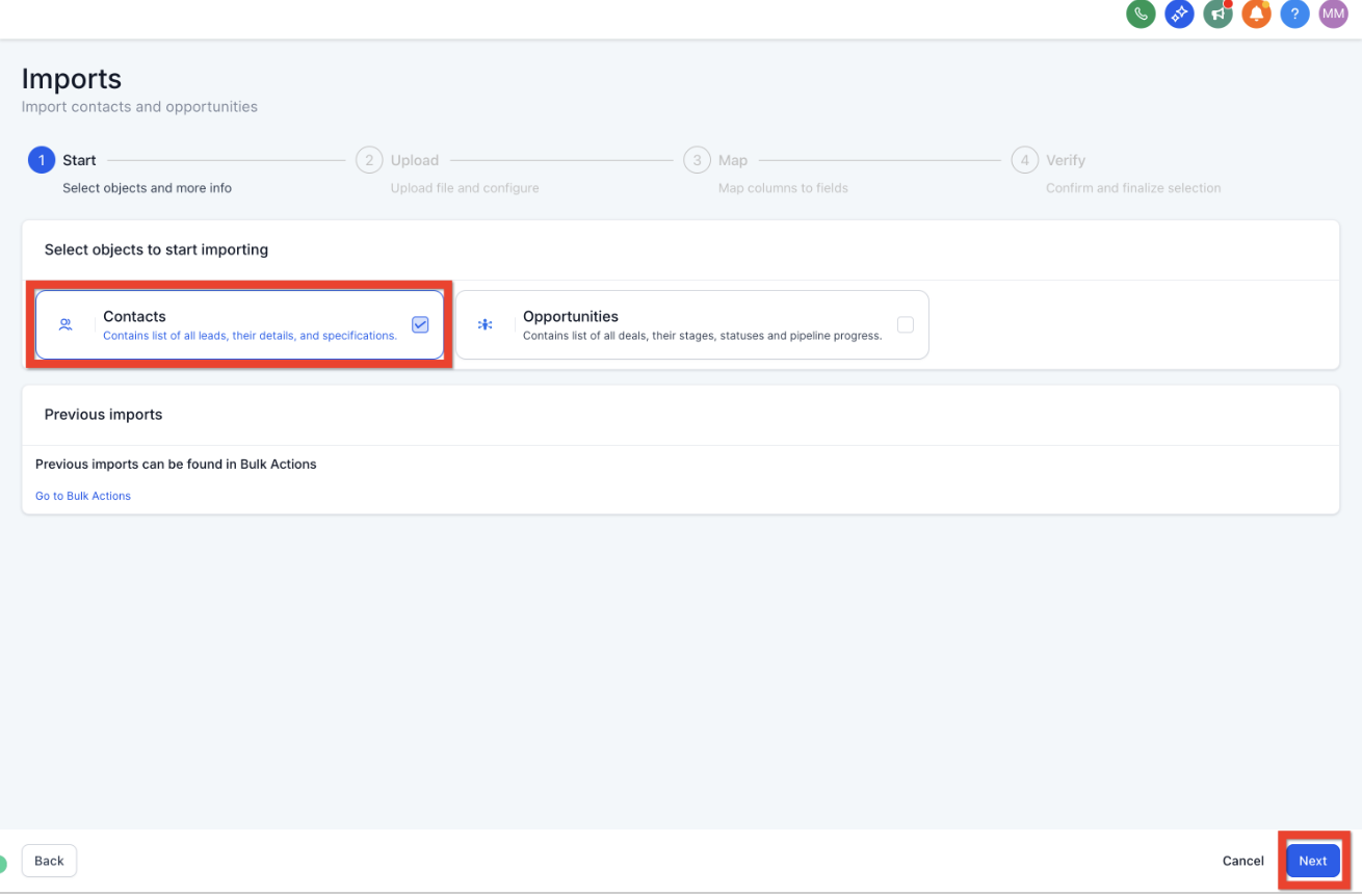 - En la pantalla de importación, selecciona Contactos y haz clic en Siguiente.