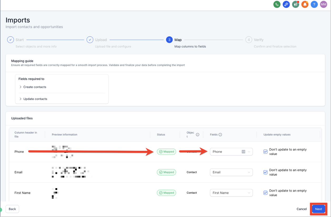 - Asocia las columnas de tu archivo con los campos del sistema (por ejemplo: nombre, email, teléfono).