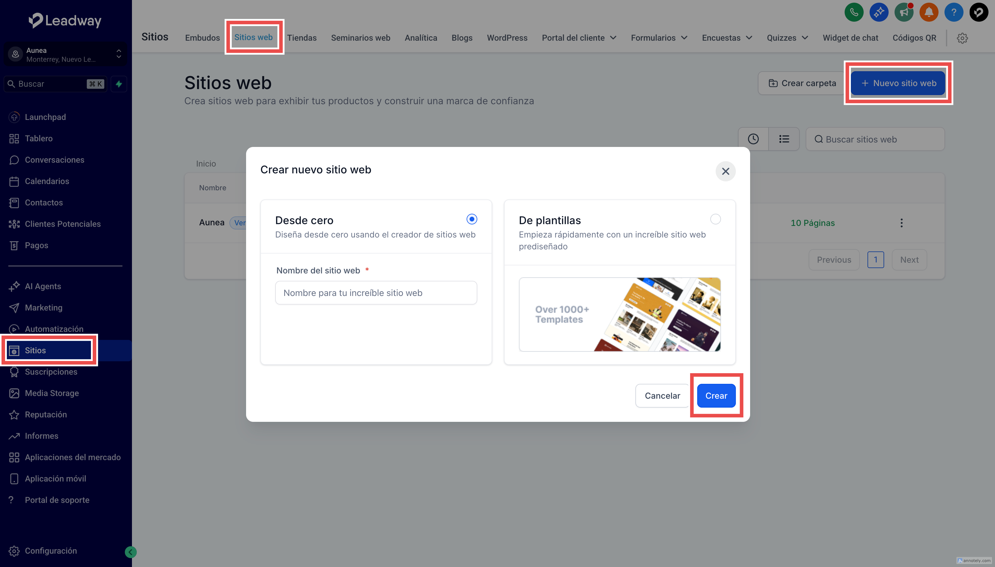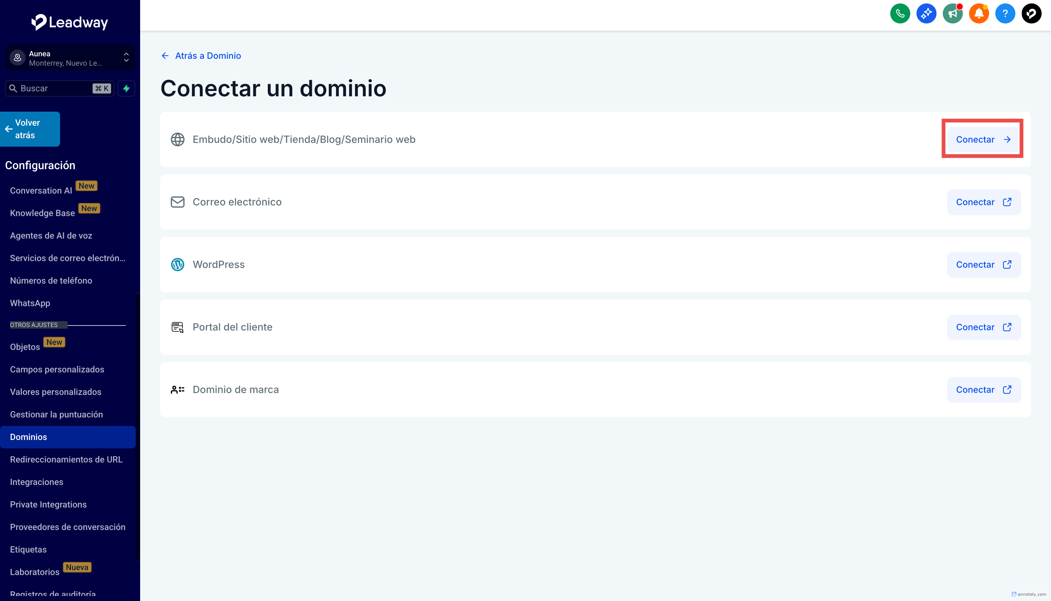 Haz clic para conectar un sitio web: Usa la opción para blog/embudo/sitio web/etc.
