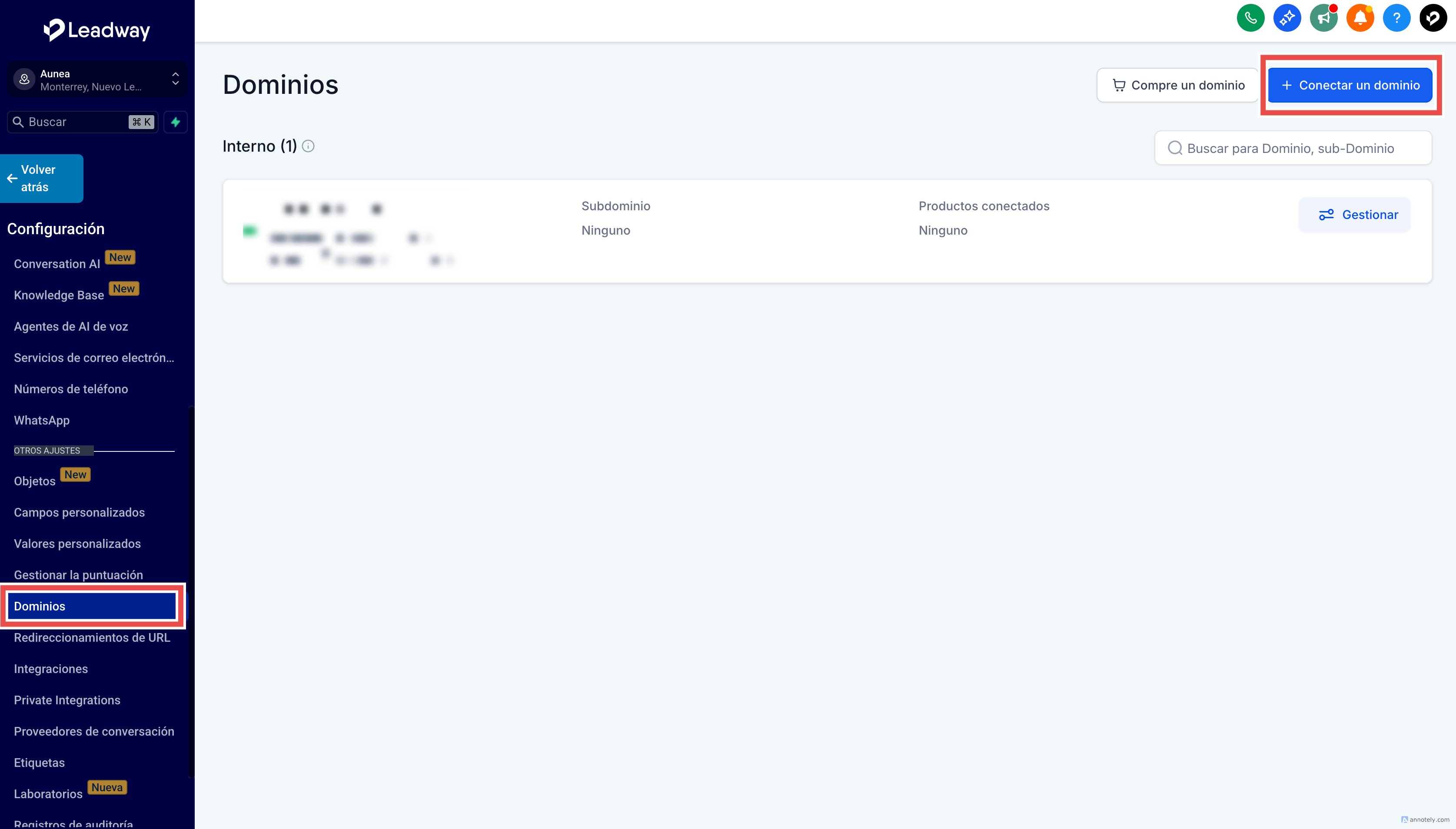 En Dominio haz clic en Agregar/Editar dominios: Encuentra la sección de dominio y haz clic para conectar.