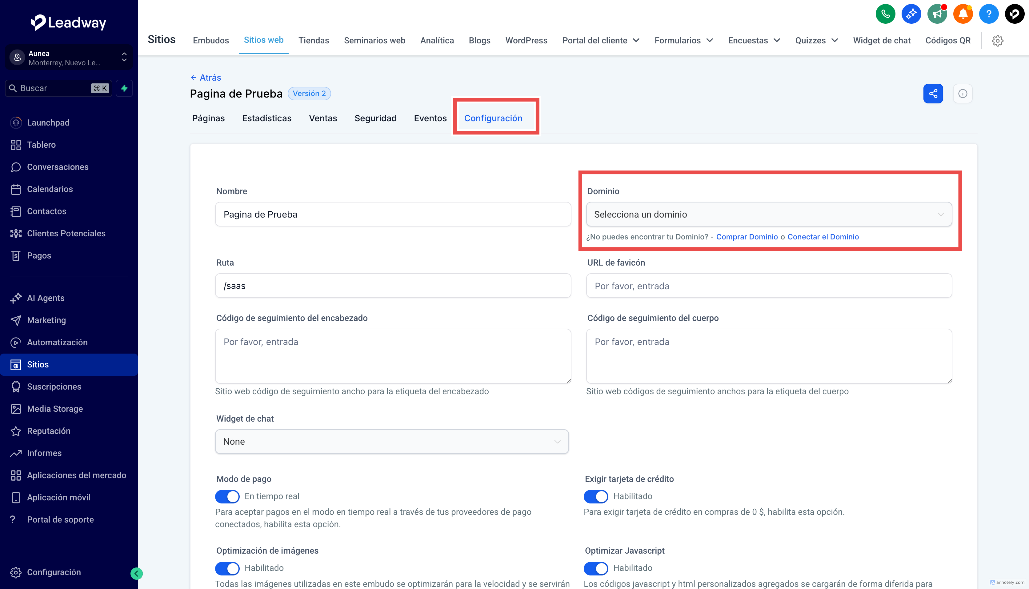 Haz clic en la pestaña Configuración: Ve a la configuración para conectar tu dirección web personalizada.