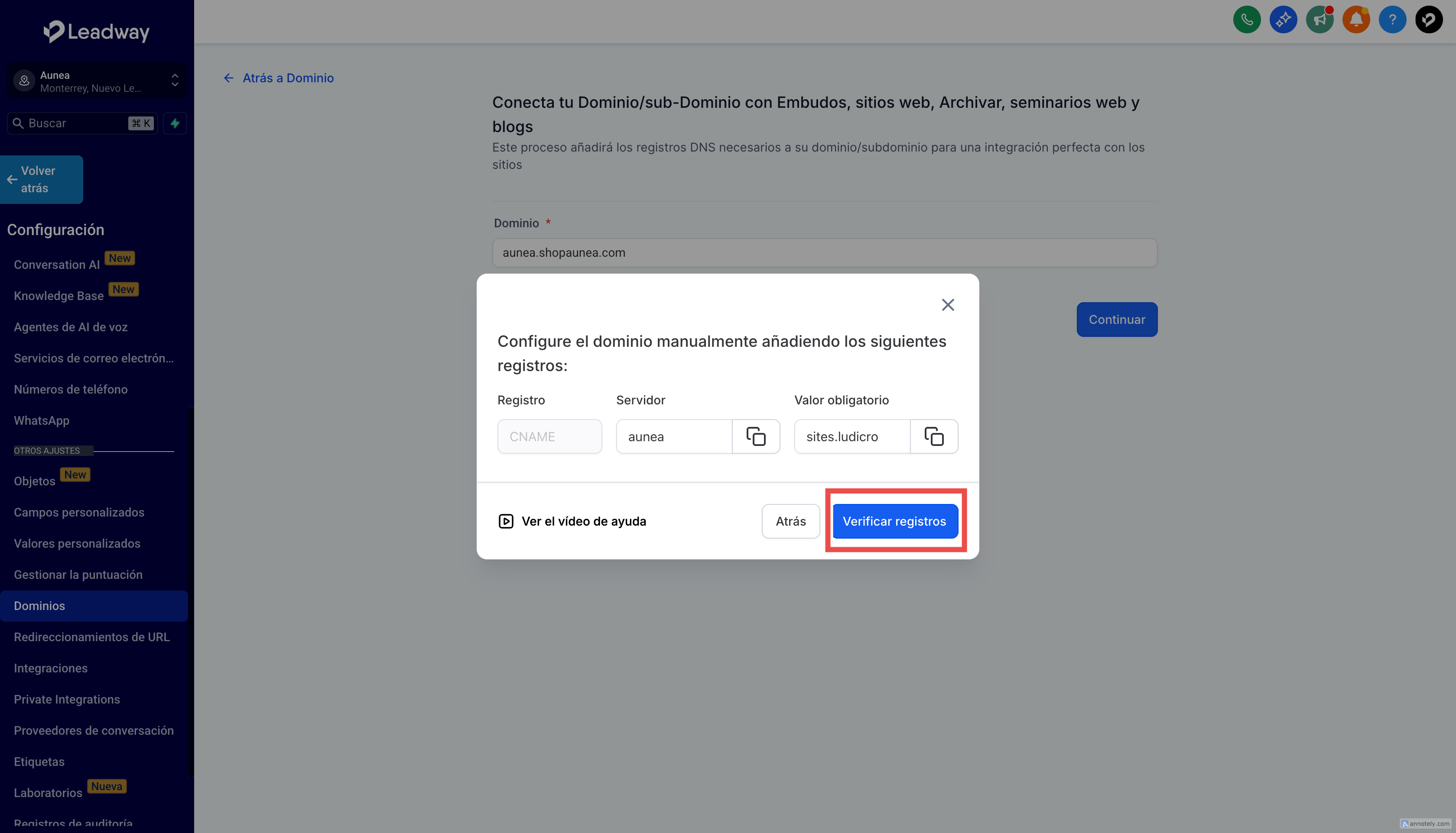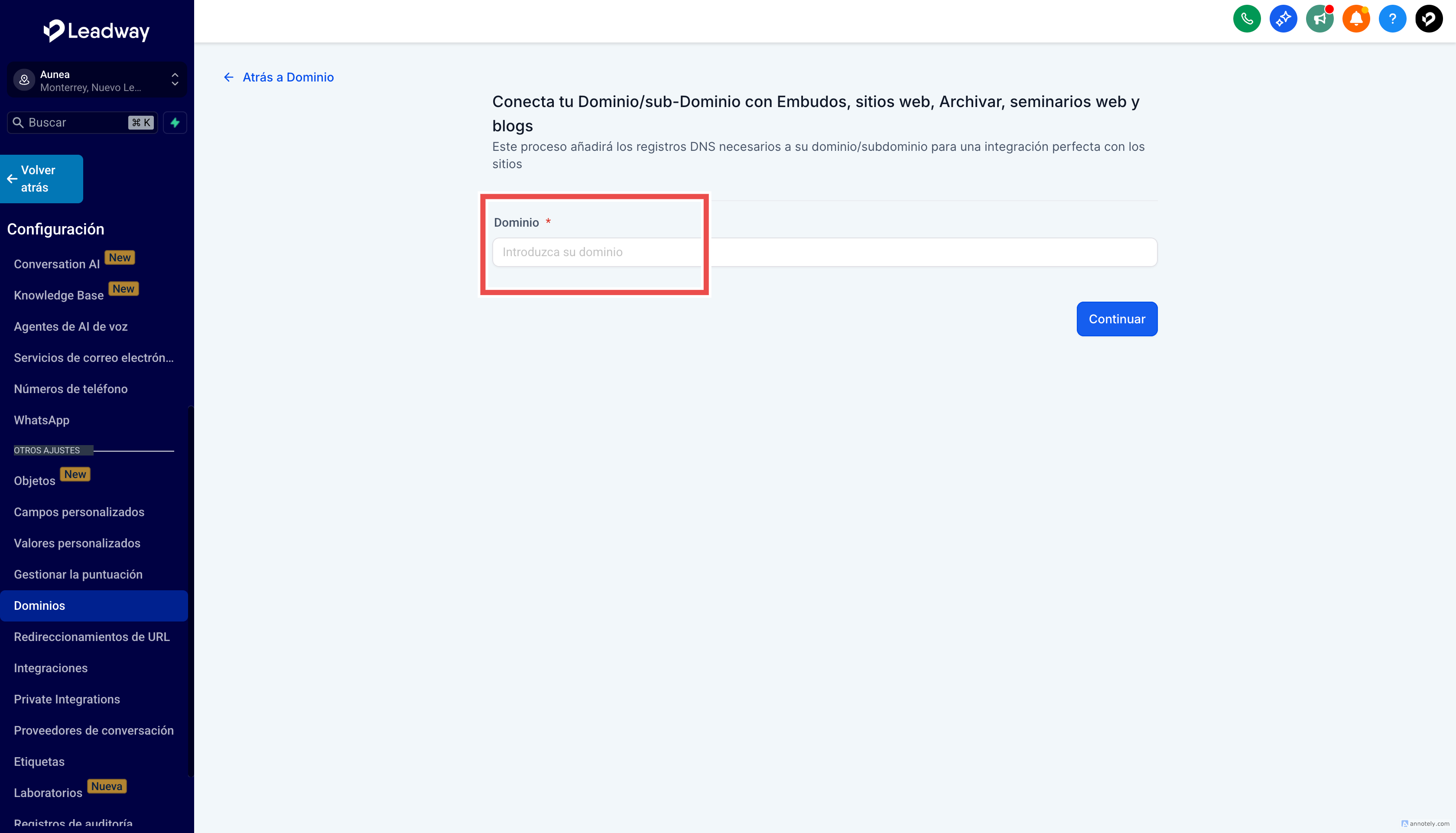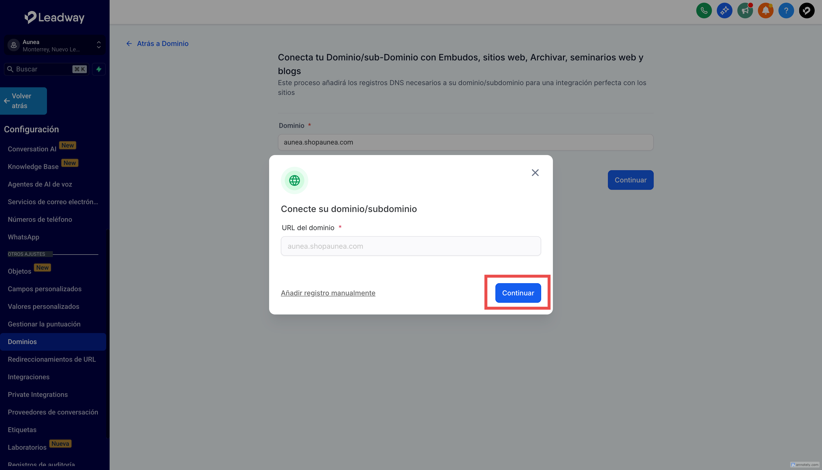 Haz clic en Conectar un dominio: Ingresa tu nombre de dominio y haz clic en "Continuar" dos veces. ¡Ya casi terminas!