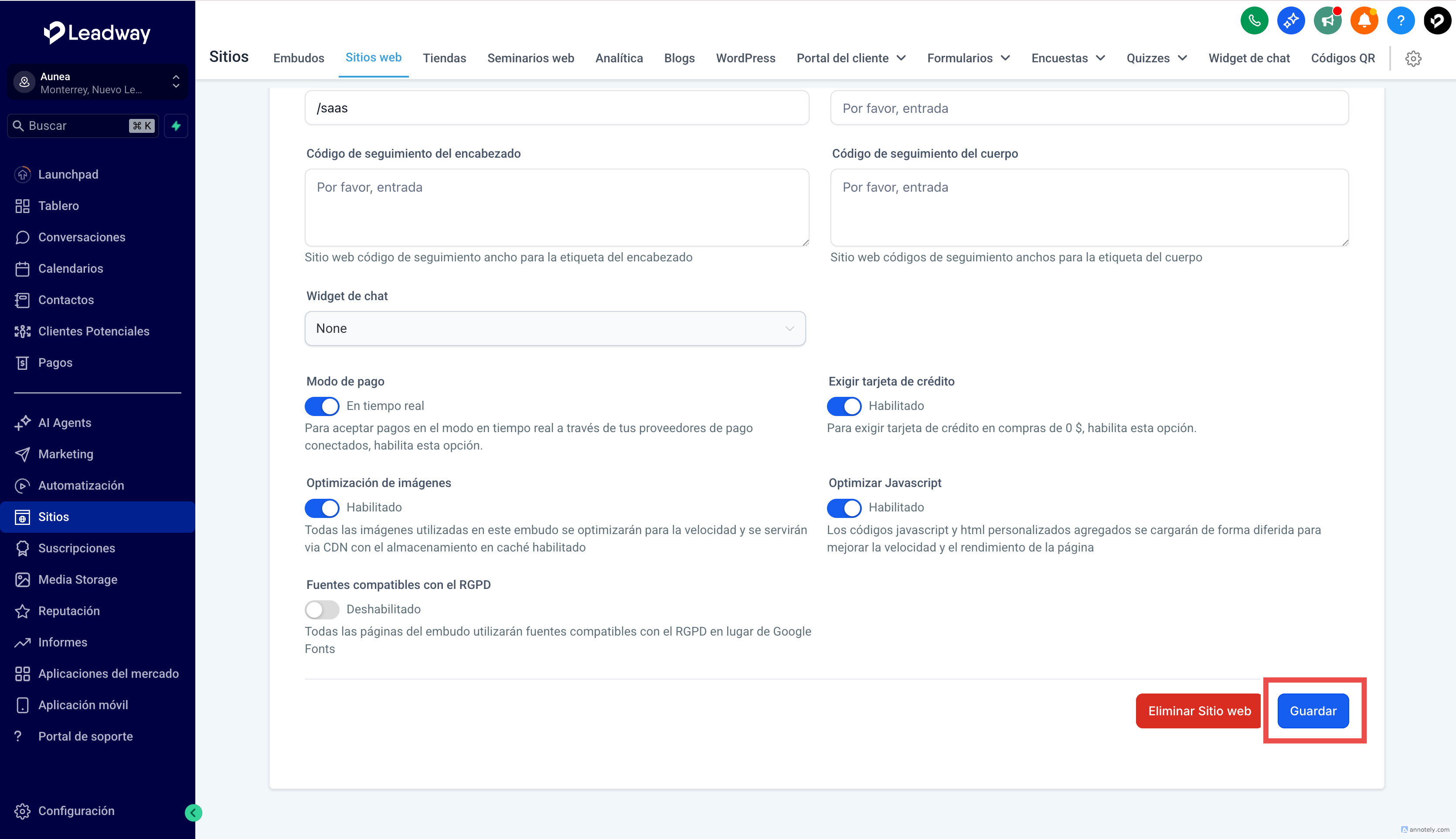 15. Regresa a la pestaña Configuración del sitio web: Vuelve a la configuración una última vez.