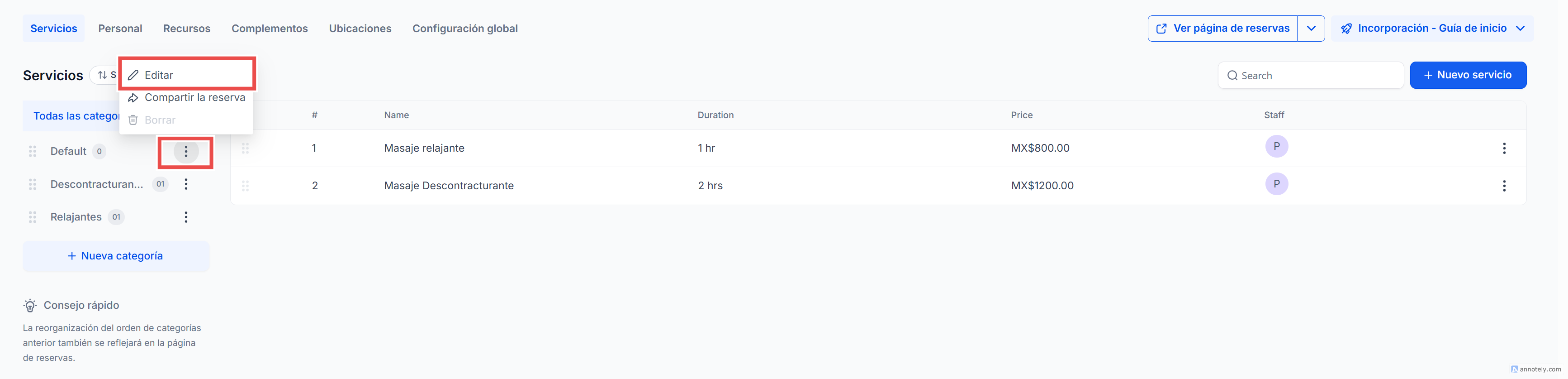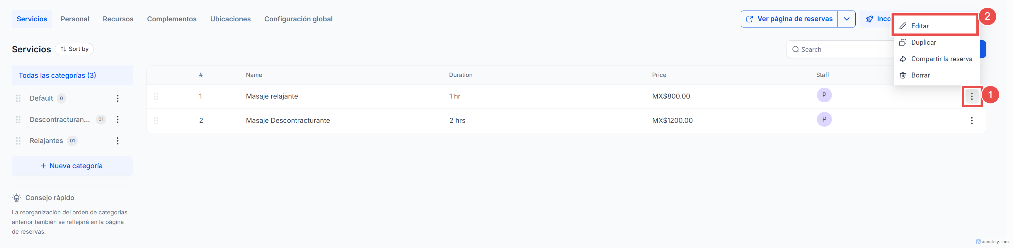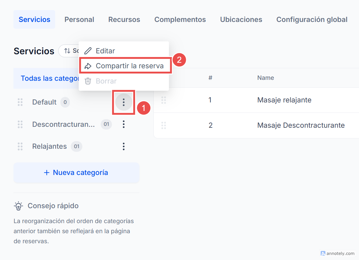 Usa nombres de categoría claros y específicos (por ejemplo, “Masajes” en lugar de “Bienestar”).