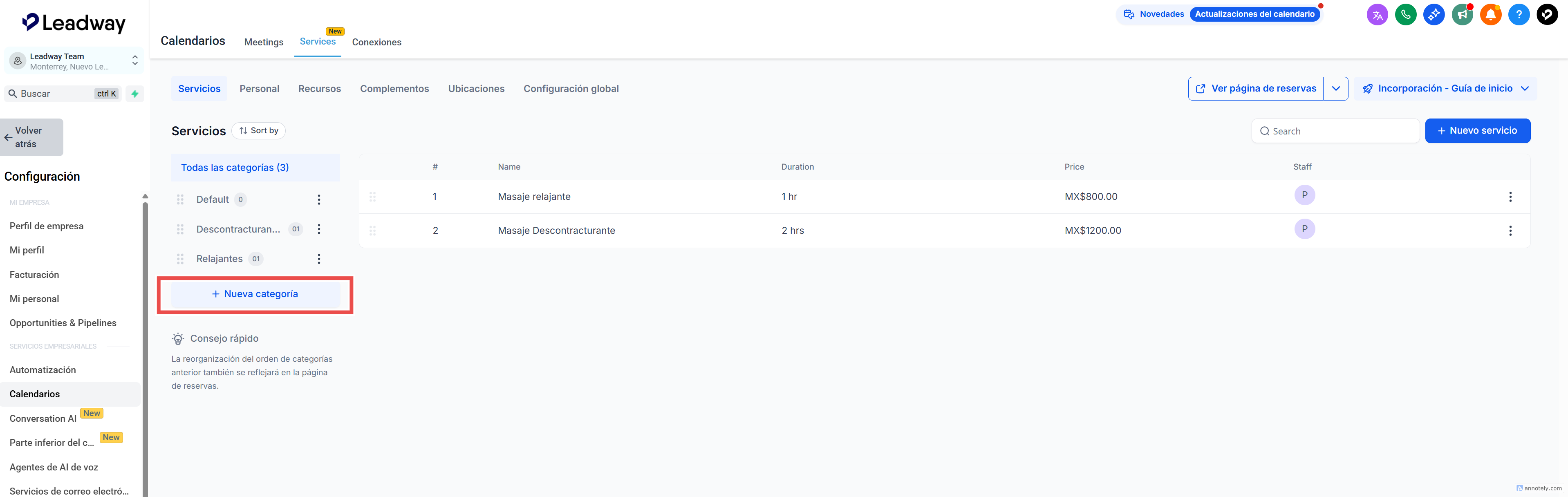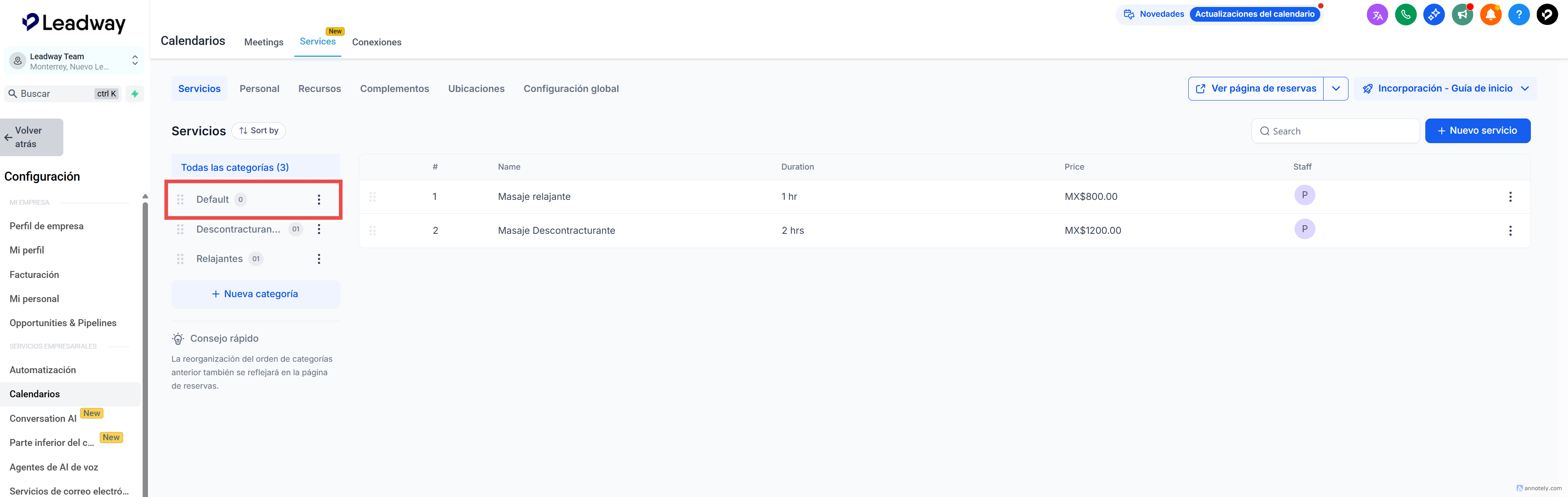 Coloca cada servicio dentro de la categoría correspondiente para que aparezca en la sección correcta de tu página pública de reservas.