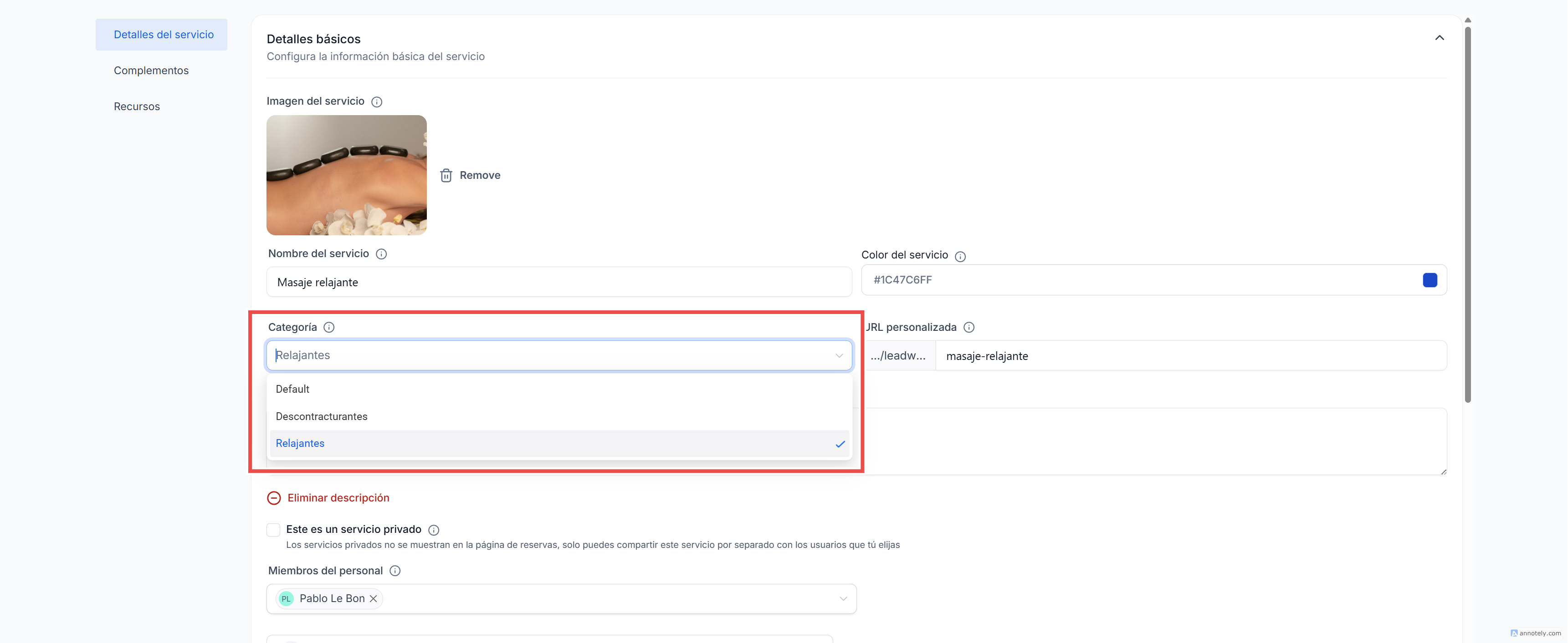 Usa el menú desplegable de Categoría para seleccionar la categoría a la que se asignará el servicio.