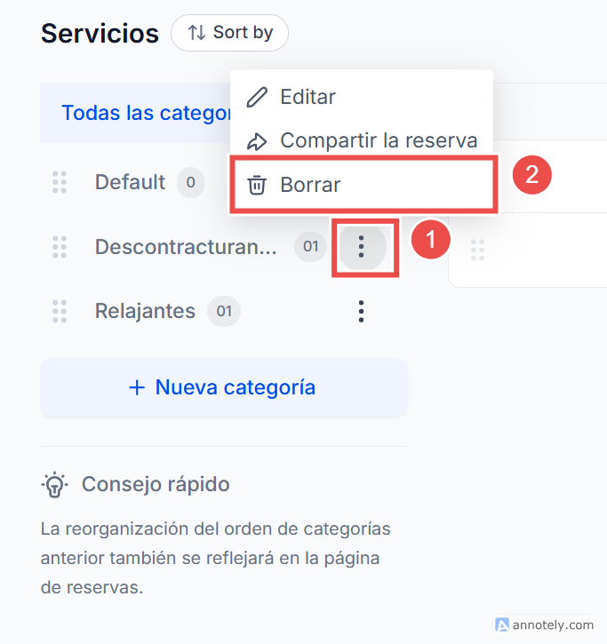 Elimina las categorías que ya no necesites, manteniendo tus servicios accesibles para los clientes.