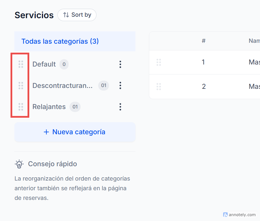 Controla el orden en que tus clientes ven las categorías en la página de reservas para ofrecer una experiencia de navegación más clara y atractiva.