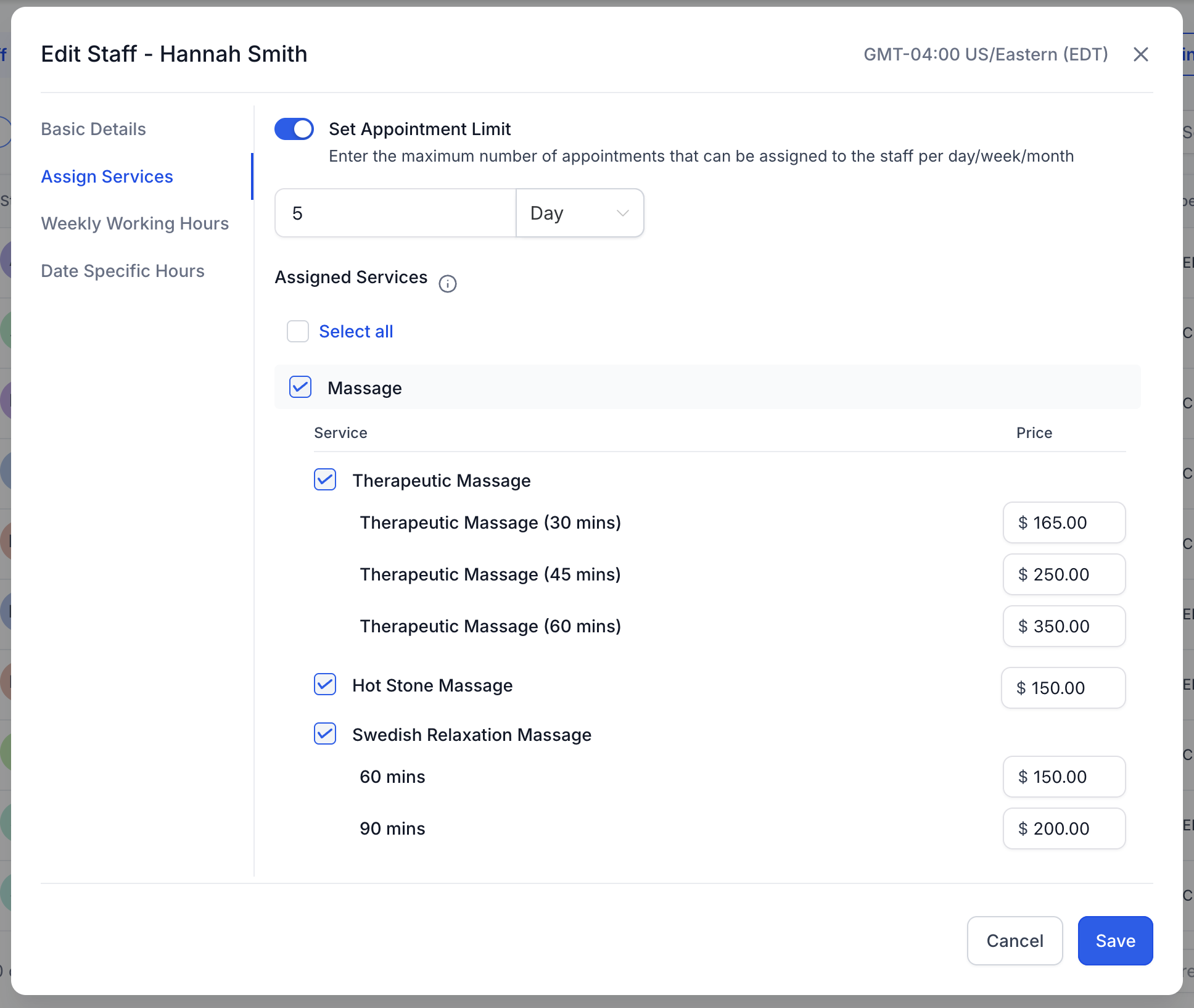 Límite de citas (nuevo): establece, de forma opcional, un tope de citas por día, semana o mes que se pueden asignar a este miembro del personal.