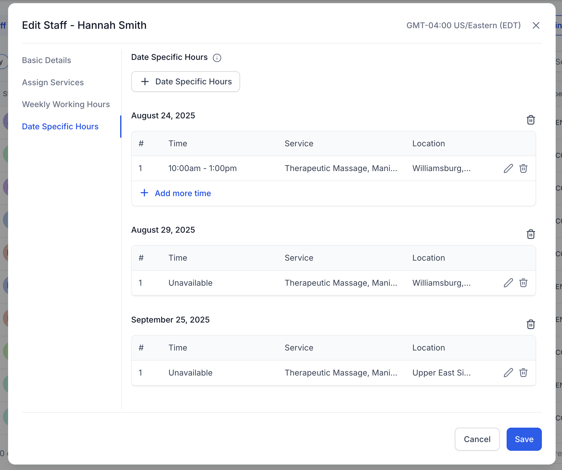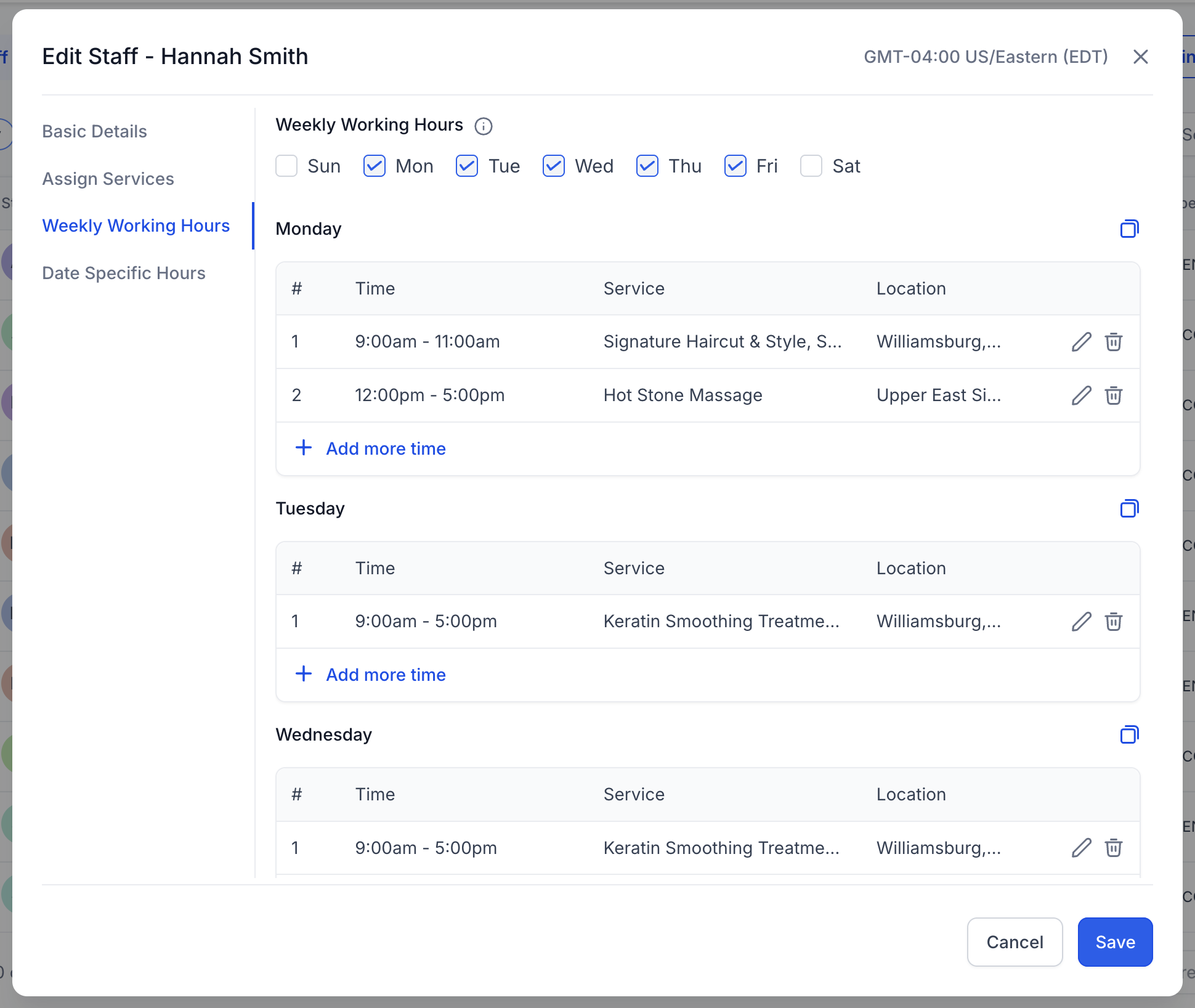 Verifica que cada miembro del personal tenga horarios de disponibilidad configurados para los servicios asignados; de lo contrario, no podrá ser reservado por los clientes.