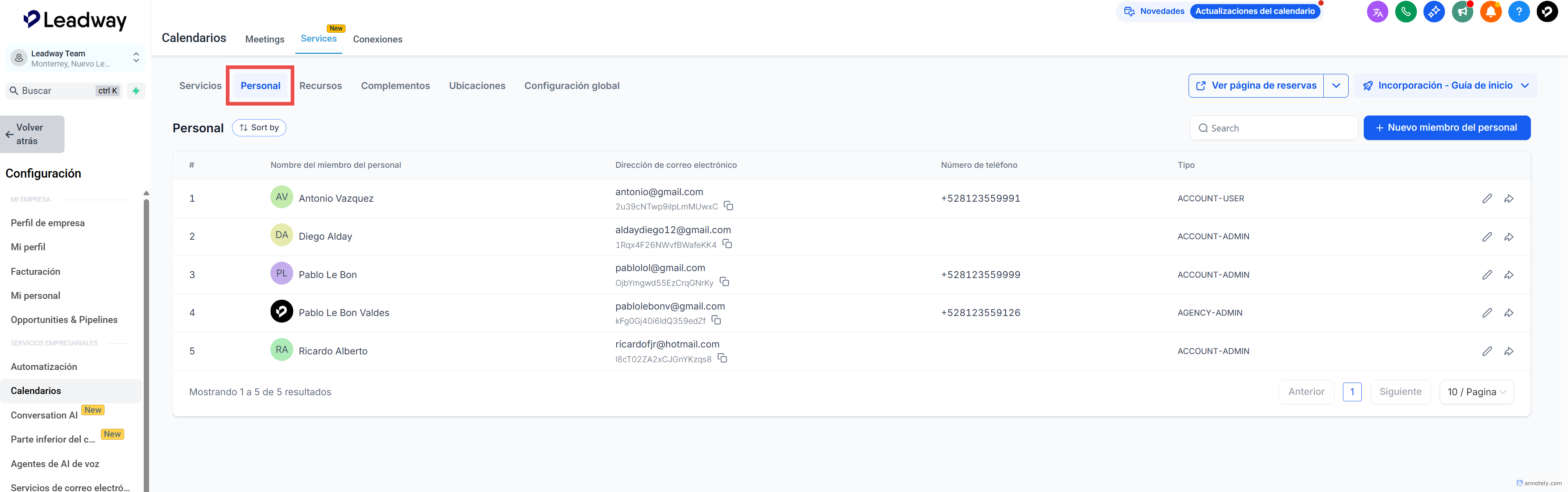 Calendarios > Configuración del calendario > Servicios > Personal