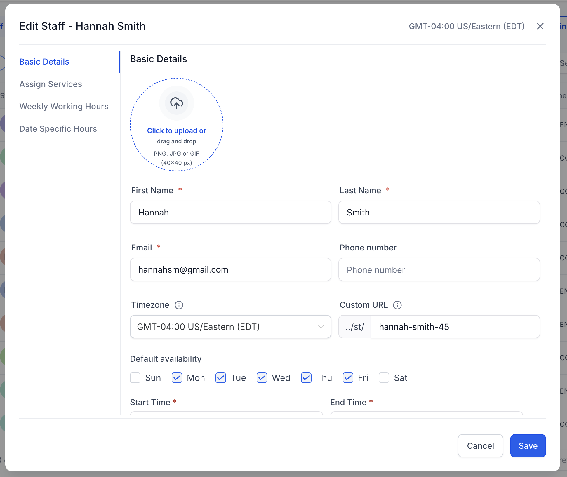 Si la disponibilidad predeterminada de Hannah está configurada de lunes a viernes, de 9:00 a. m. a 5:00 p. m., cada vez que se le asigne un servicio, ese será su horario activo por defecto.