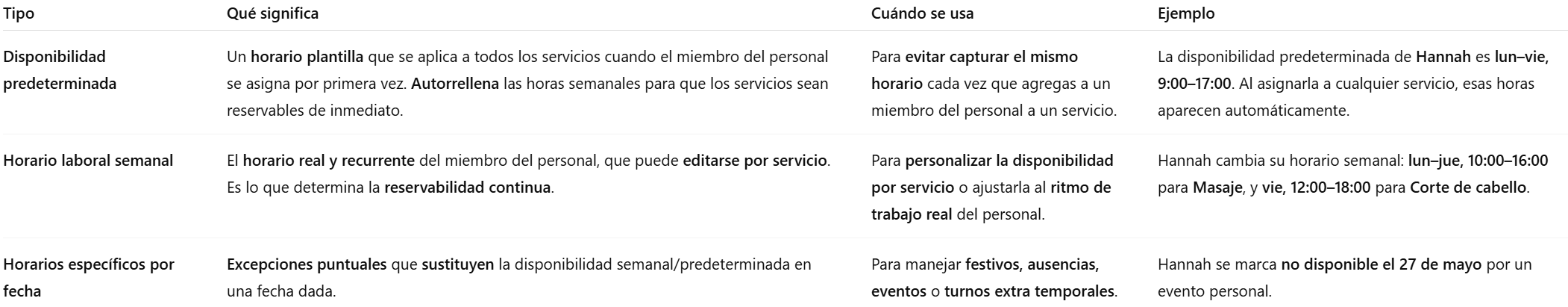 Horario laboral semanal: representa el horario recurrente real del miembro del personal. Este es el que determina cuándo puede ser reservado semana tras semana.