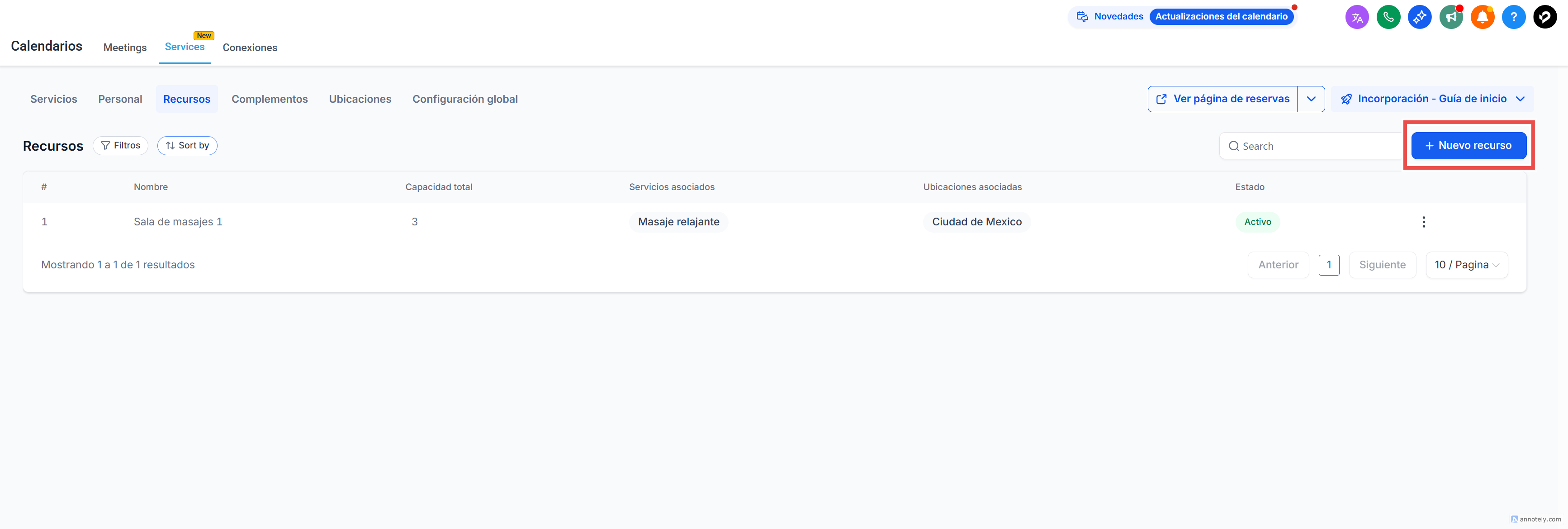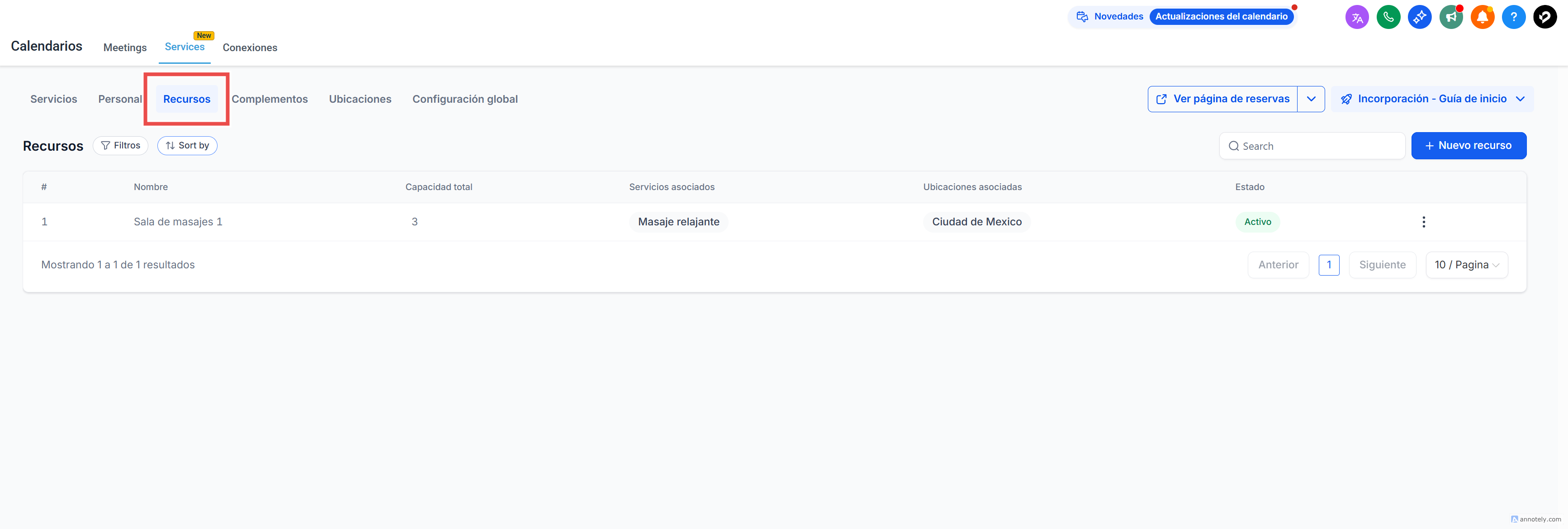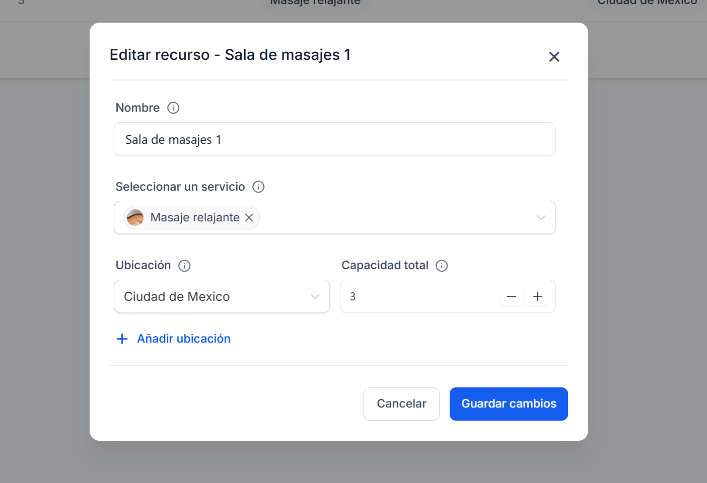 Nota: Actualmente, cada servicio solo puede reservar un recurso a la vez, pero puedes asignar varios recursos al mismo servicio (por ejemplo, Silla 1 y Silla 2).