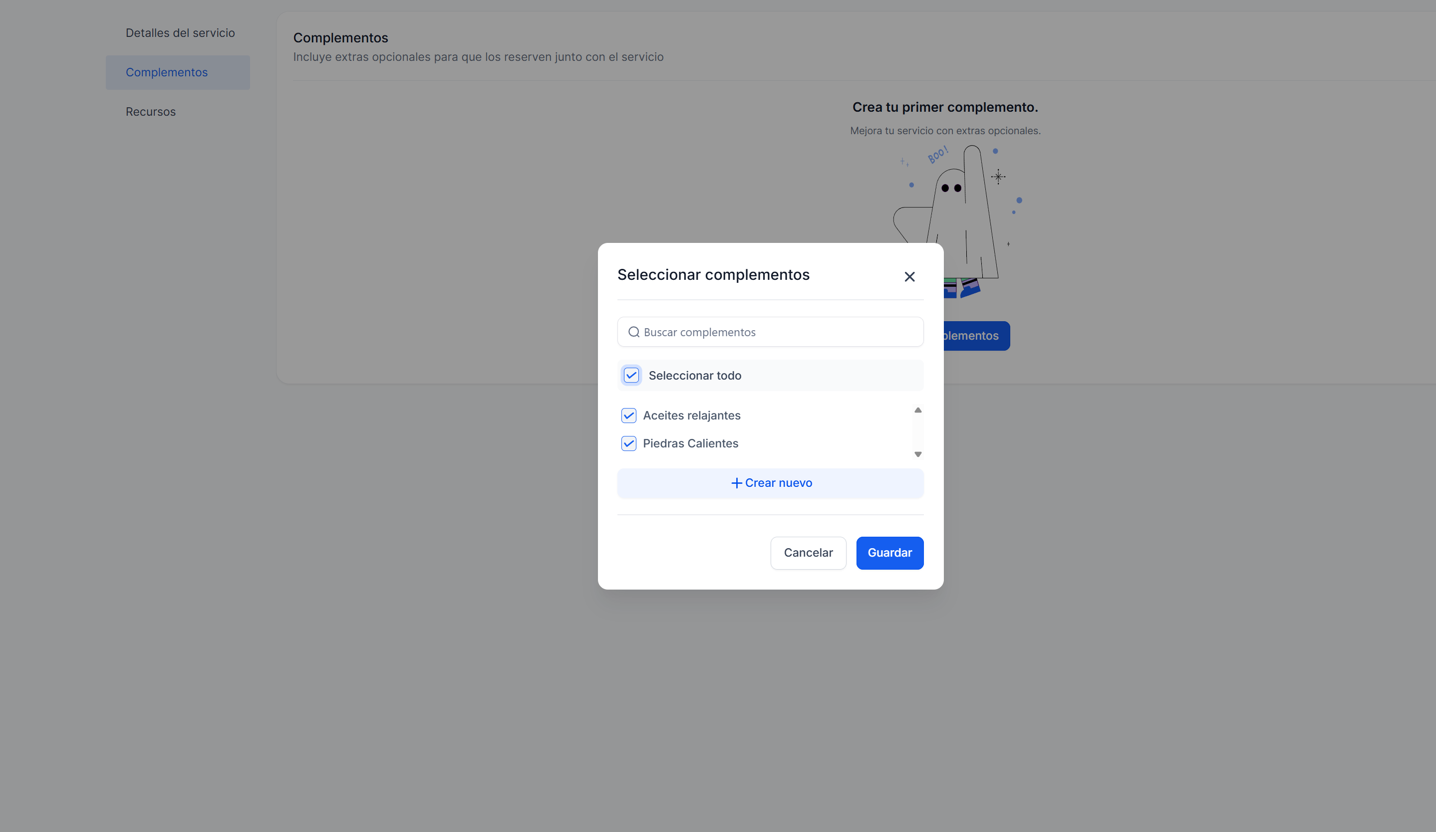 Selecciona los complementos que deseas asignar a este servicio o crea uno nuevo si es necesario.