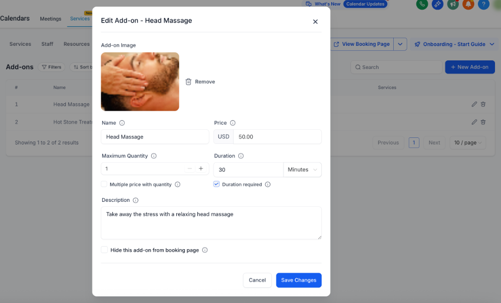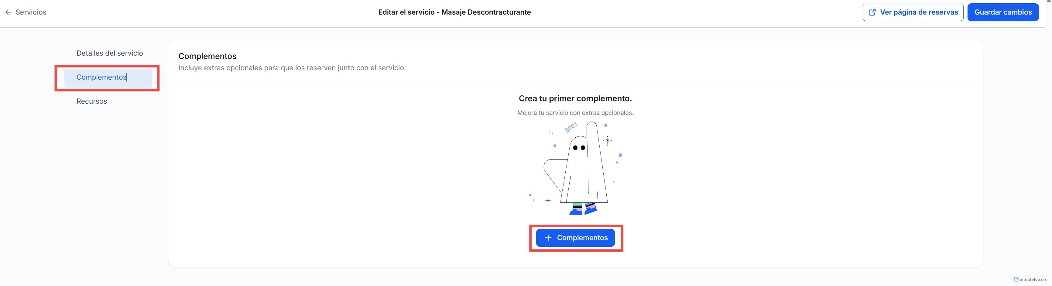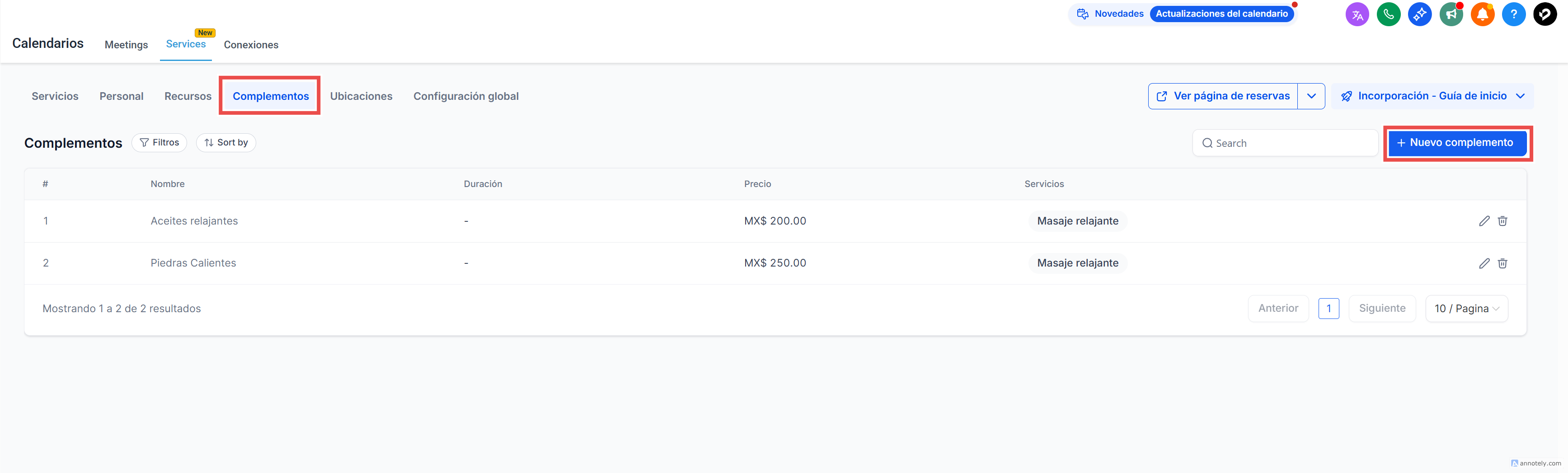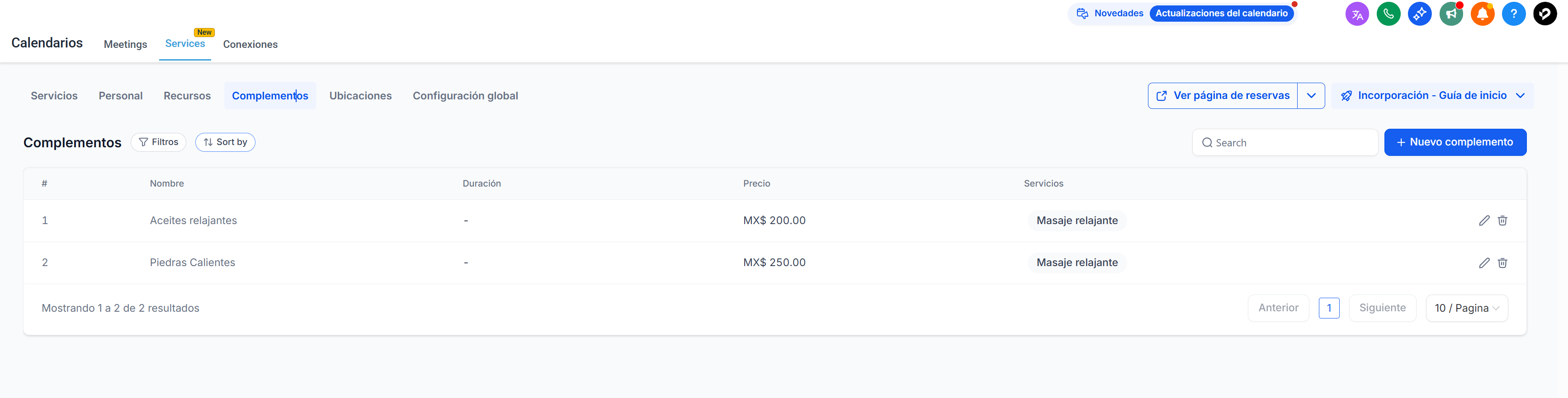 Los complementos permiten mejorar los servicios ofreciendo características adicionales o ventas complementarias (upsells), brindando a los clientes la posibilidad de personalizar su experiencia de reserva.