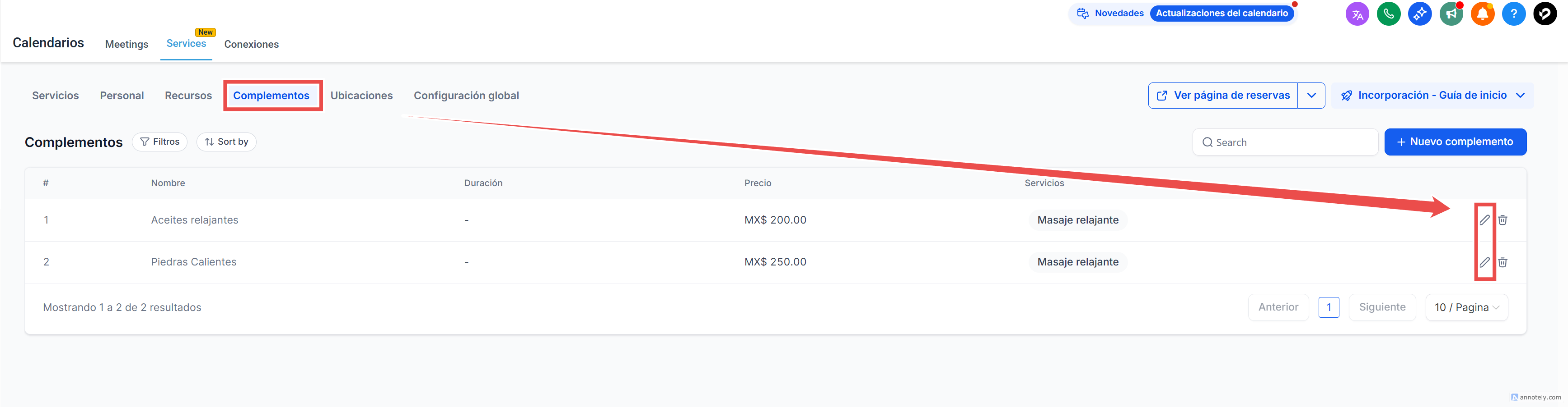 Desde la pestaña “Complementos”: aquí encontrarás una lista centralizada con todos los complementos creados, sin importar a qué servicio estén asociados.