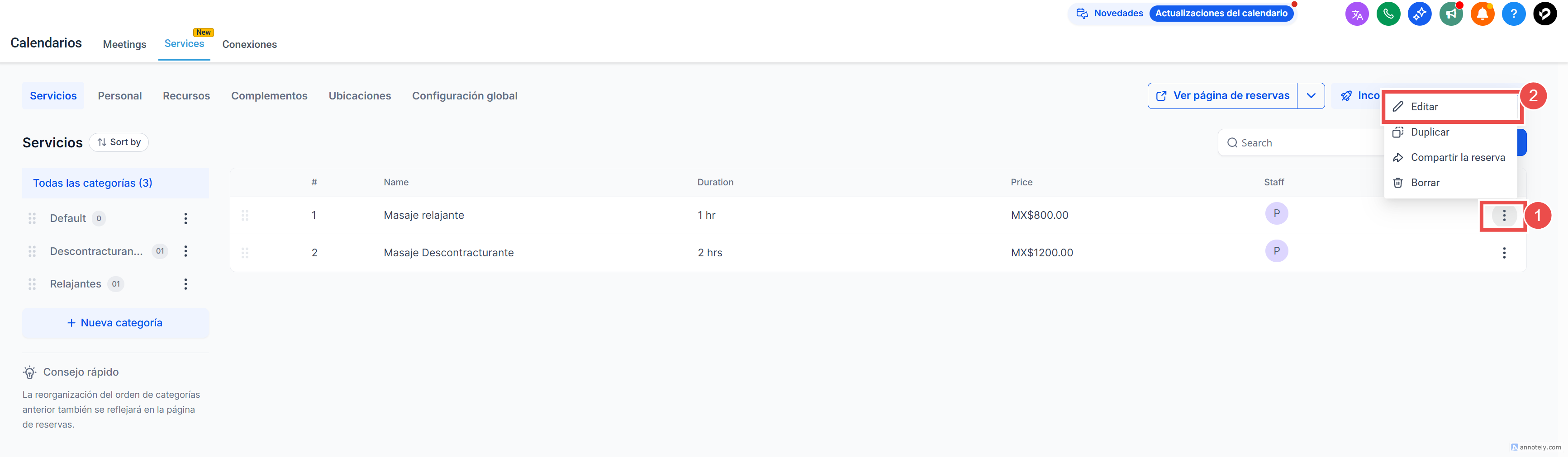 Calendarios > Configuración del calendario > Servicios -