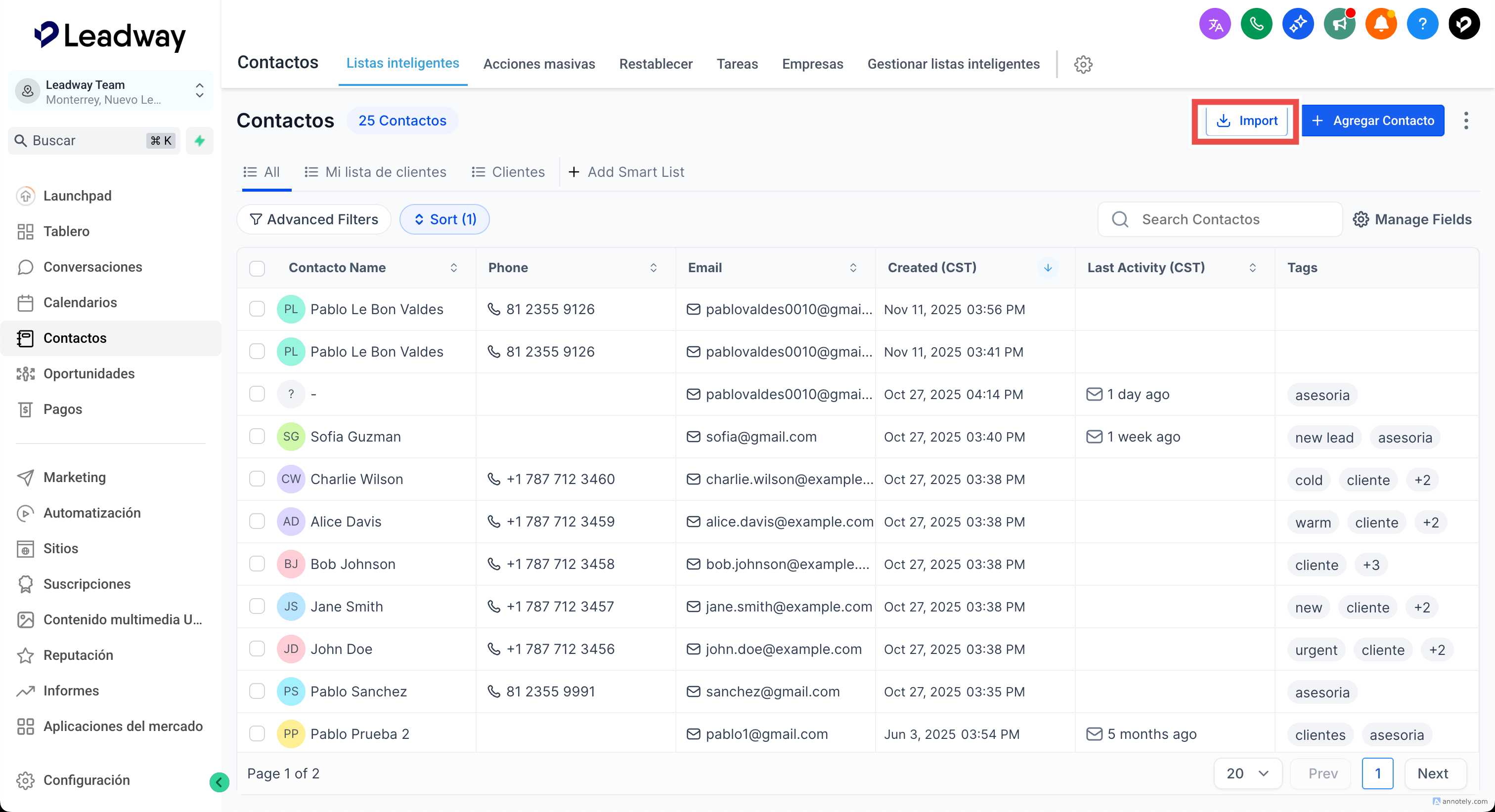 En Leadway, entra a Contactos > Importar contactos, sube los archivos CSV exportados y asigna correctamente los campos (nombre, apellido, correo, etc.).