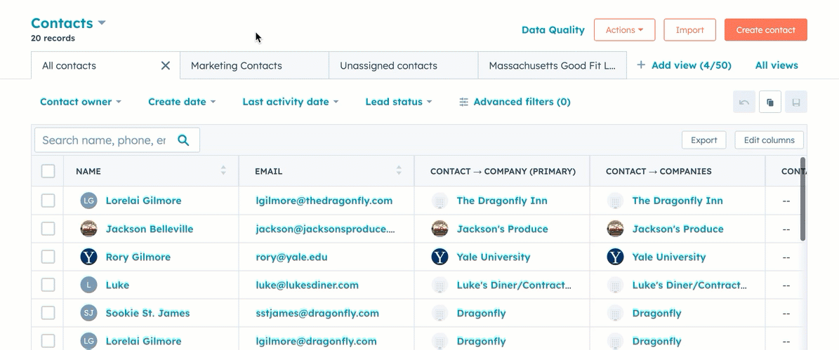 Para contactos y empresas, ve a Contacts > Contacts y CRM > Companies, y exporta todo en archivos CSV.