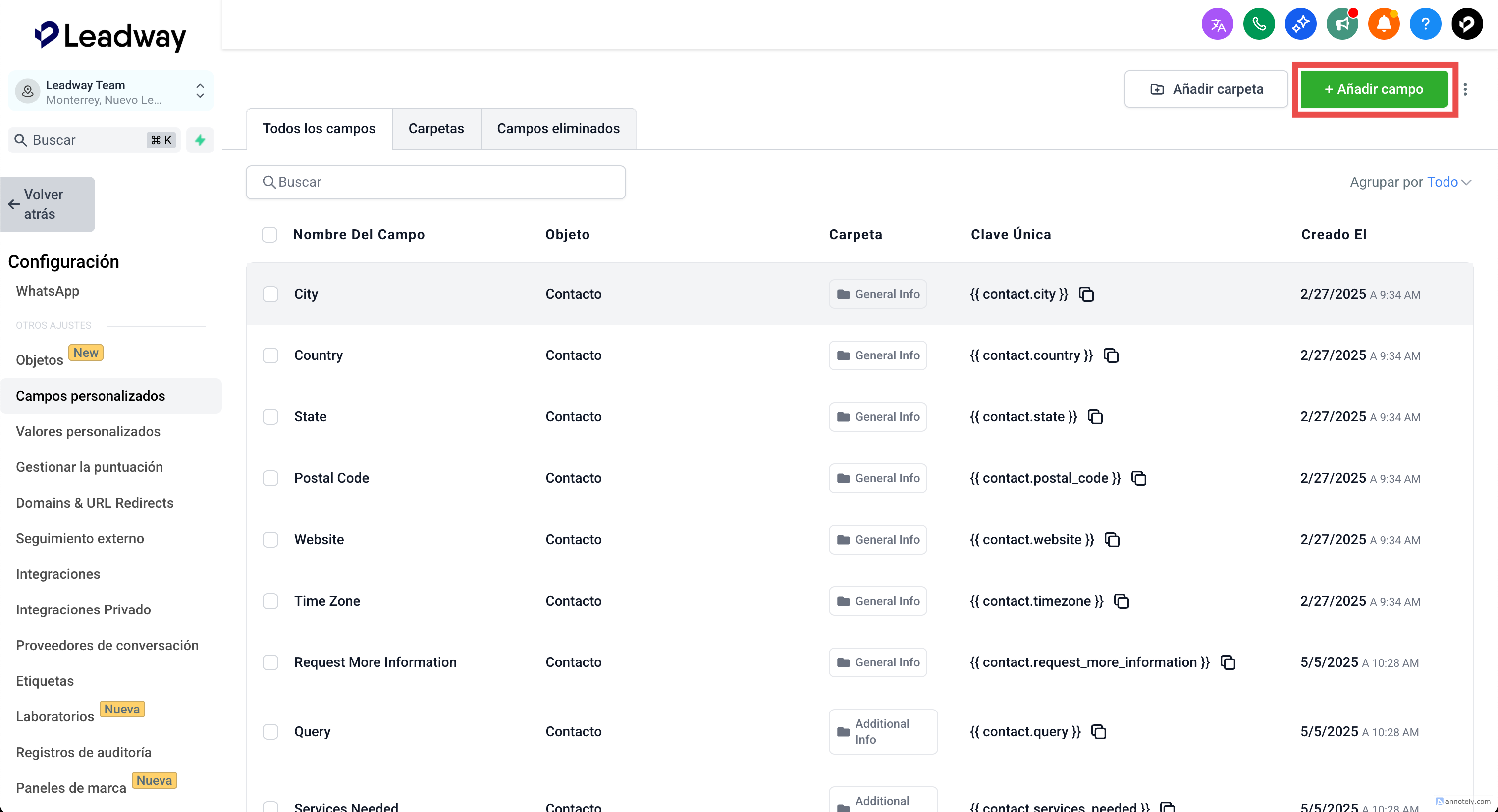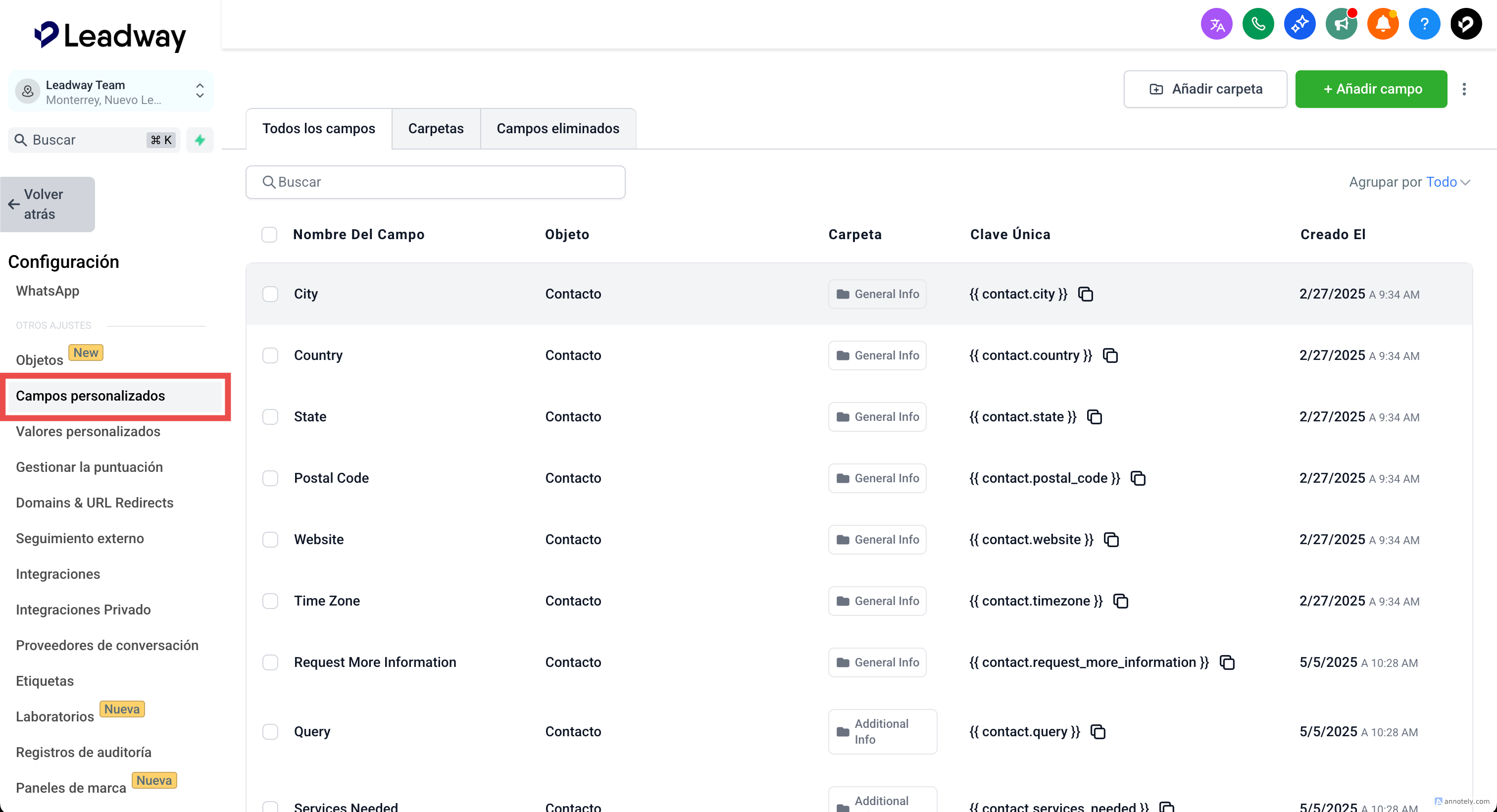 Este artículo te mostrará cómo crear y utilizar campos personalizados para recopilar y organizar la información de tus leads dentro de tu cuenta de Leadway.