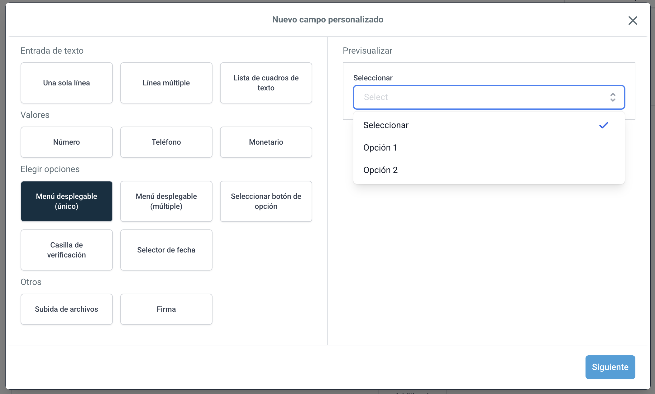 Elige el tipo de campo que deseas crear —por ejemplo: Texto, Lista desplegable, Botones de opción, Fecha, etc.