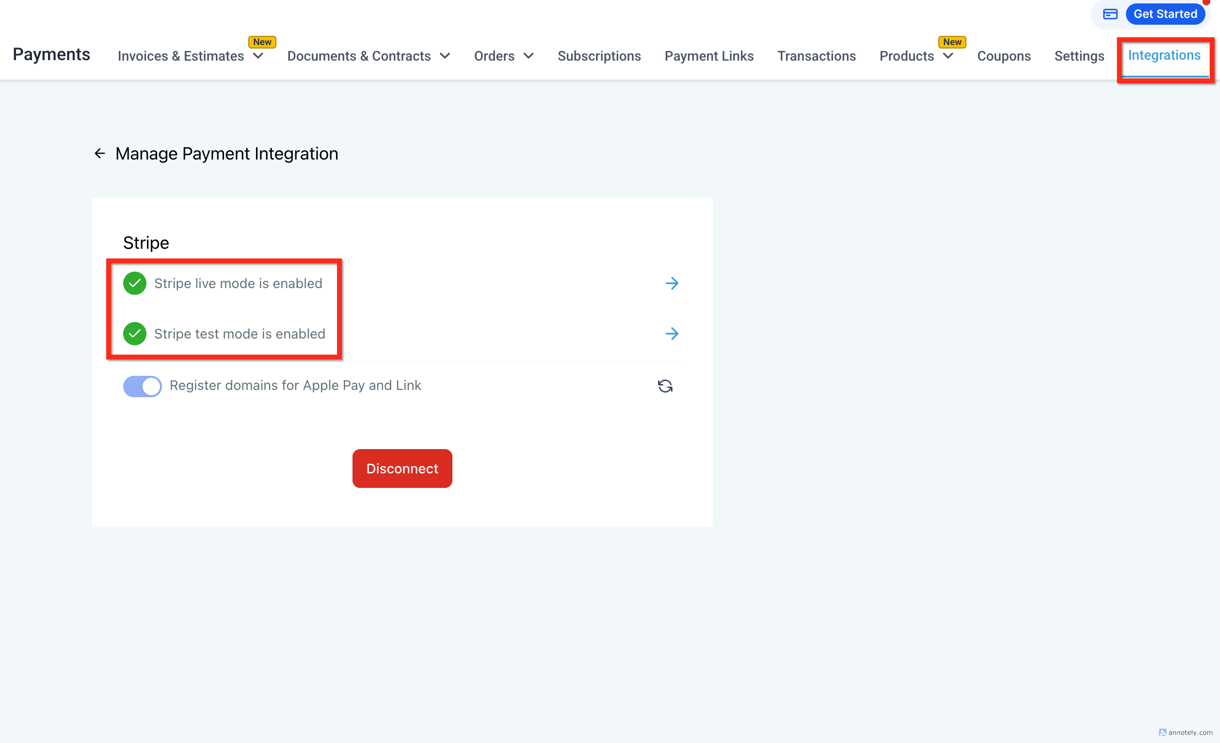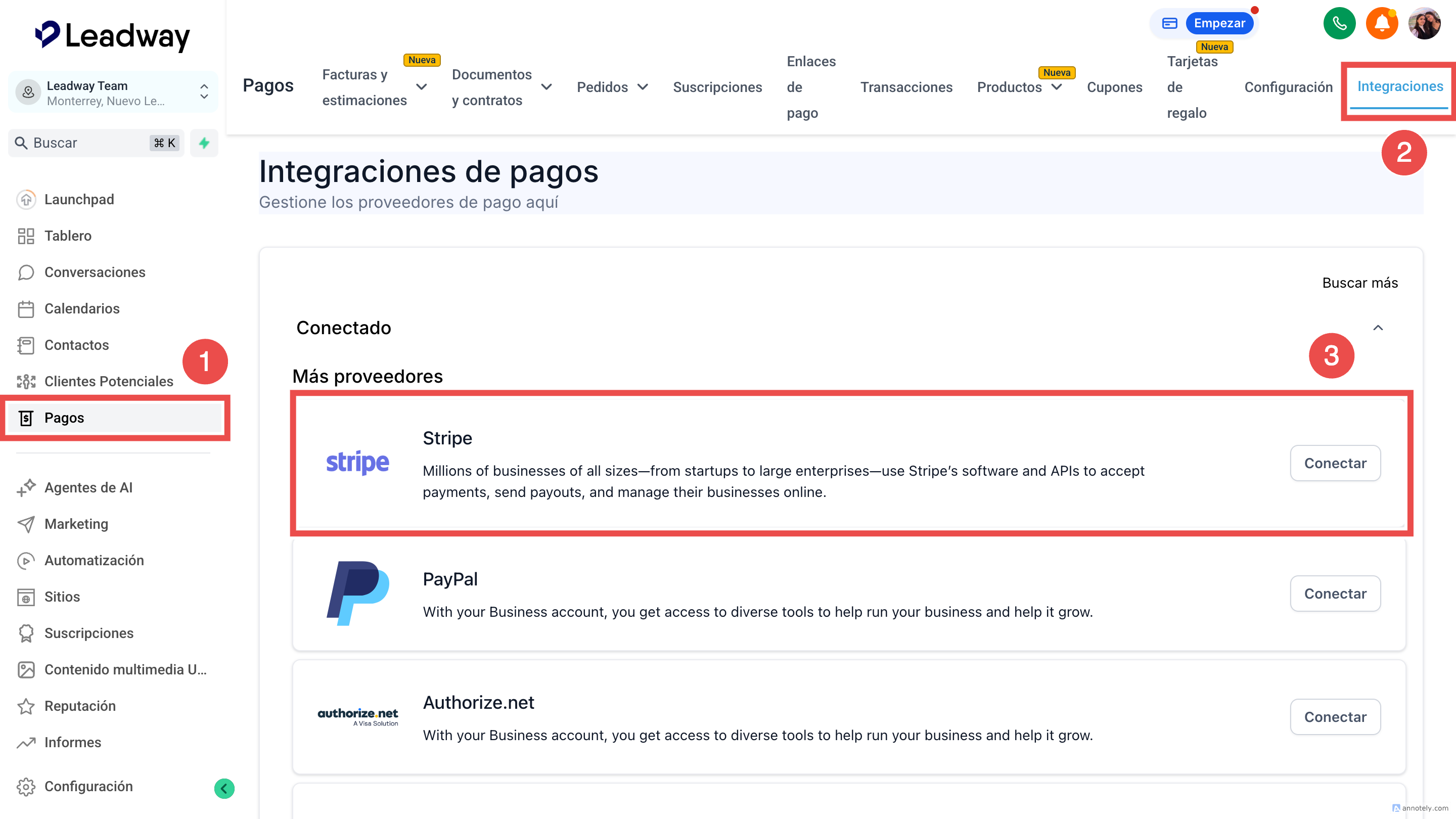 Ingresa a pagos > integraciones > haz clic en el botón conectar de Stripe