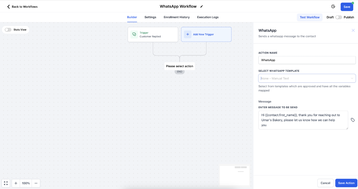 La acción de WhatsApp te permite enviar mensajes directamente desde un flujo de trabajo. Esta función es ideal para crear comunicación dinámica y en tiempo real con tus clientes a través de WhatsApp. Puedes enviar mensajes manuales o utilizar plantillas previamente aprobadas.