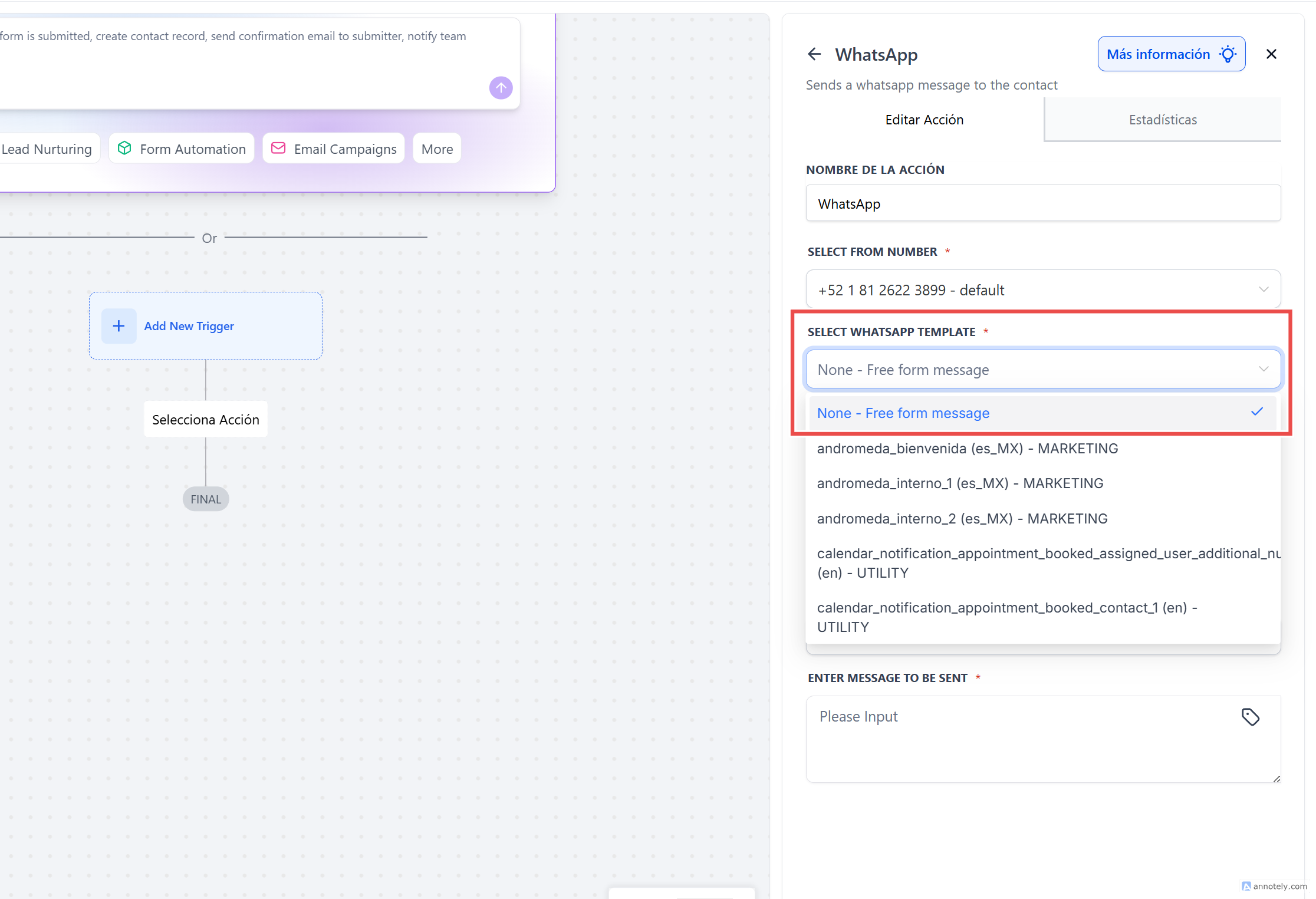 La acción Enviar mensaje por WhatsApp permite enviar mensajes automáticamente a tus clientes según los disparadores configurados en el flujo de trabajo. Puedes enviar mensajes de texto libres dentro de la ventana de 24 horas, o usar plantillas aprobadas para iniciar conversaciones fuera de esa ventana.