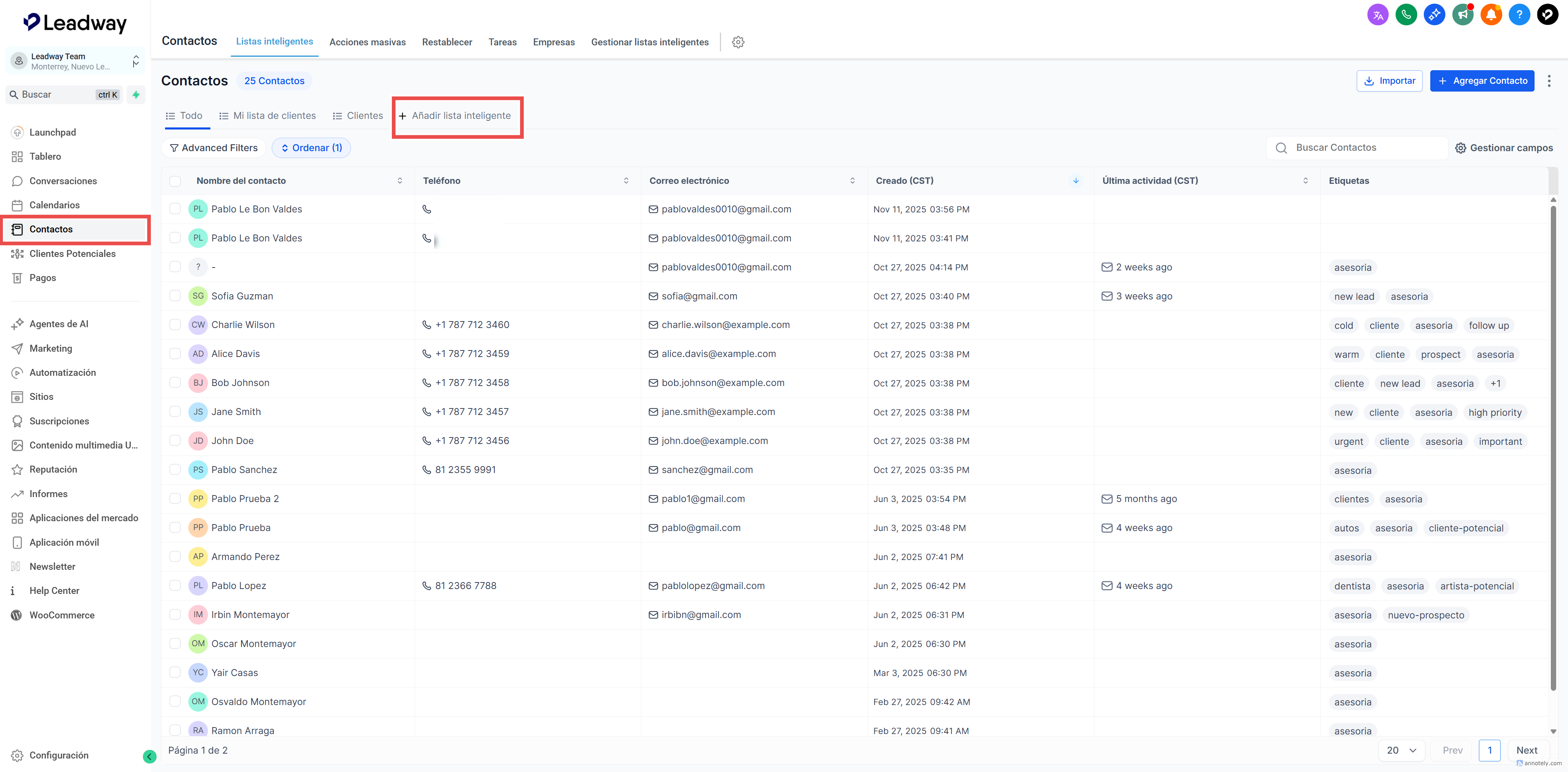Ve a Contactos → Contactos/Listas inteligentes y haz clic en “Añadir lista inteligente”.