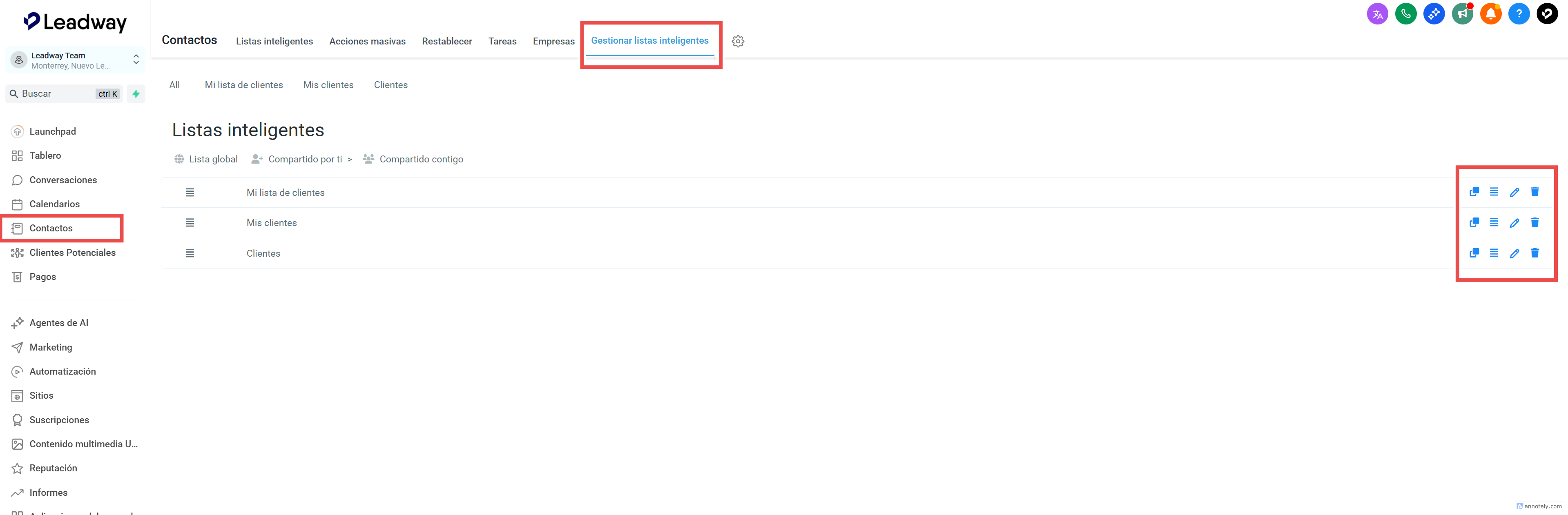 Ve a la herramienta contactos y selecciona el nombre gestionar listas inteligentes