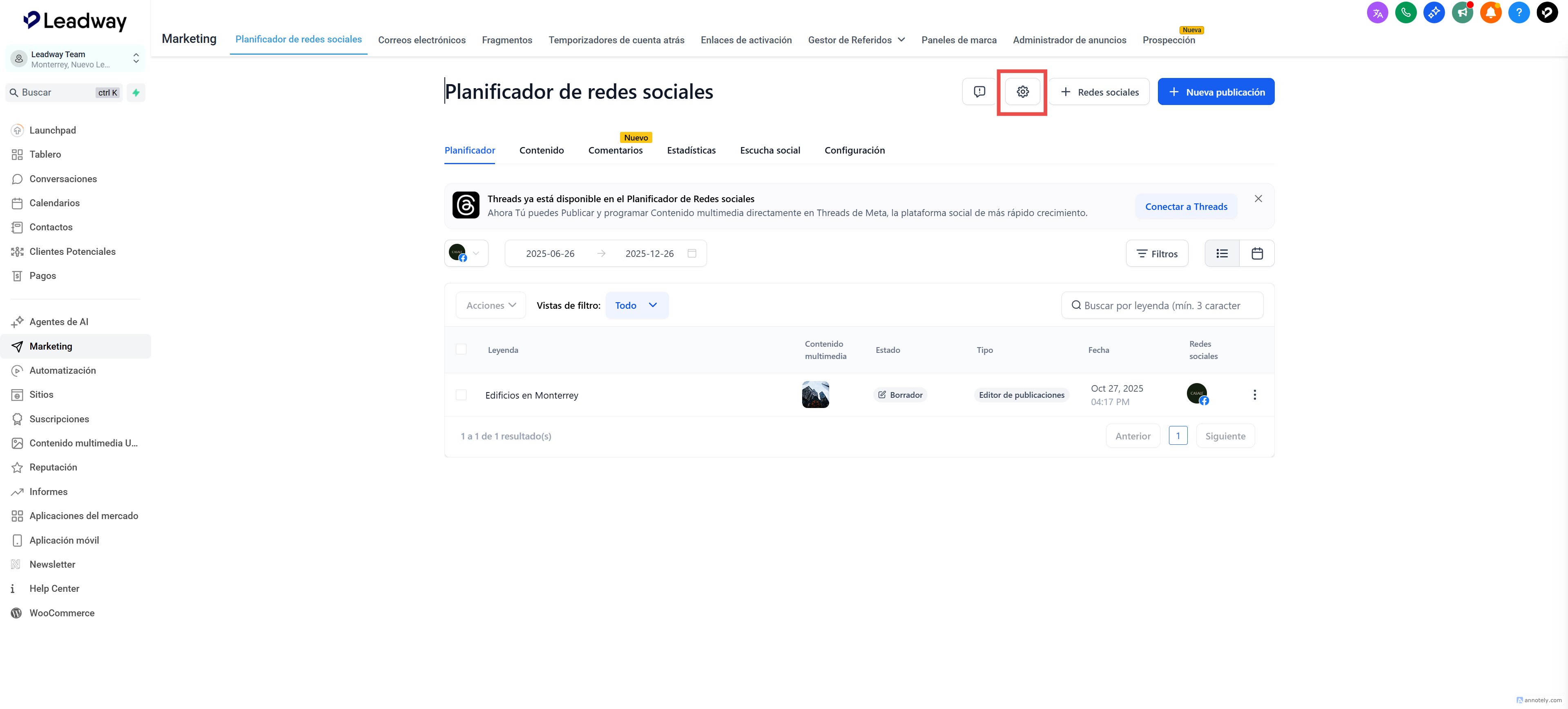 Marketing → Planificador de Redes Sociales → ajustes (icono de engrane). -