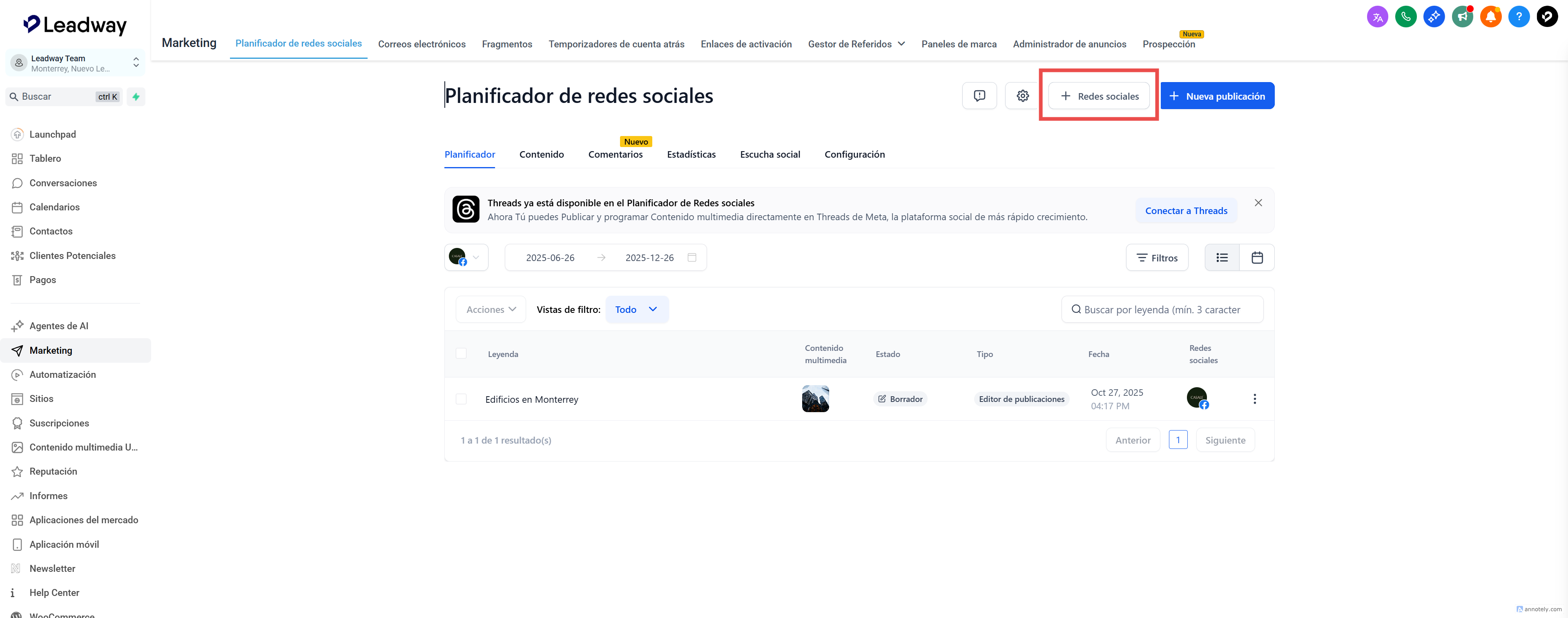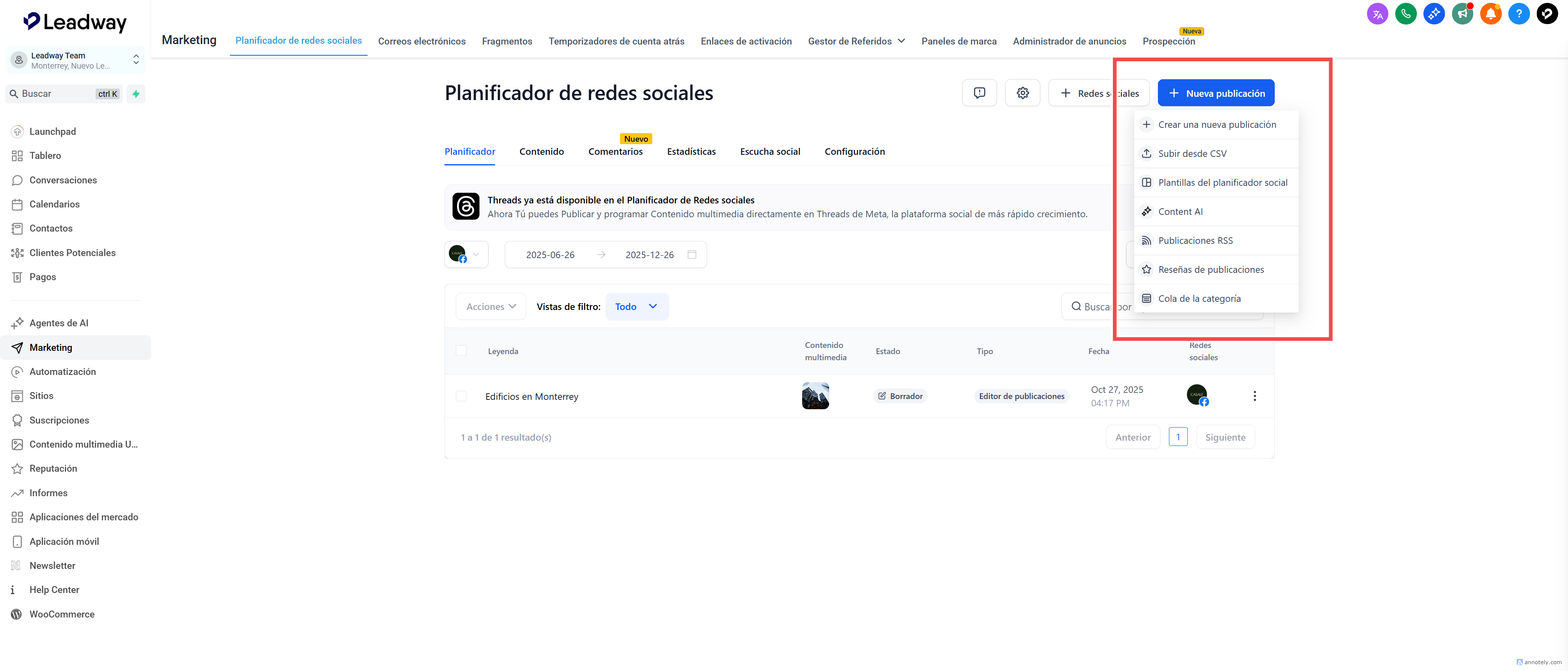 En Marketing > planificador de redes sociales, haz clic en nueva publicación