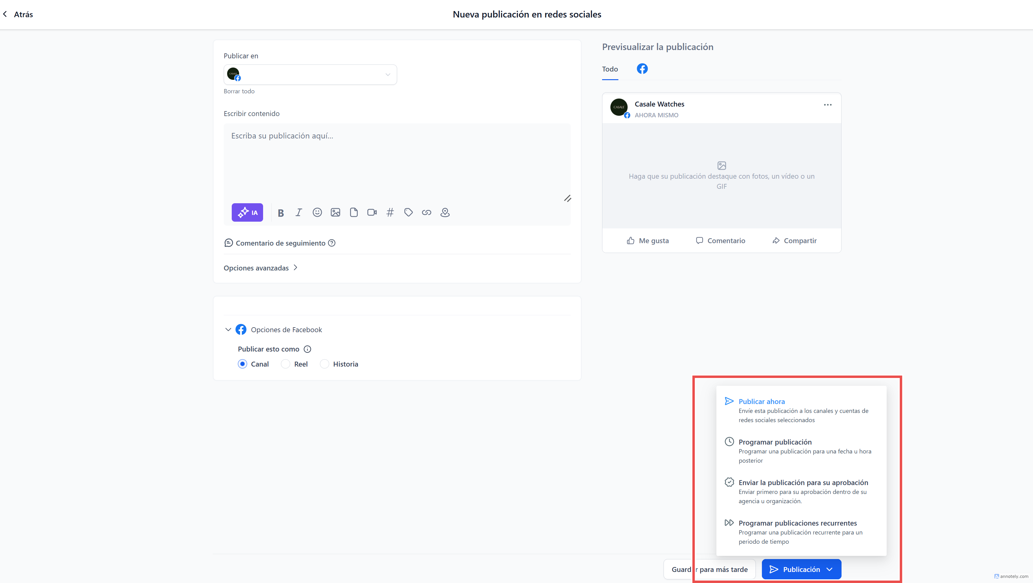 Elige si deseas guardar para después, publicar ahora, programar para más tarde, enviar para aprobación o programar como publicación recurrente.