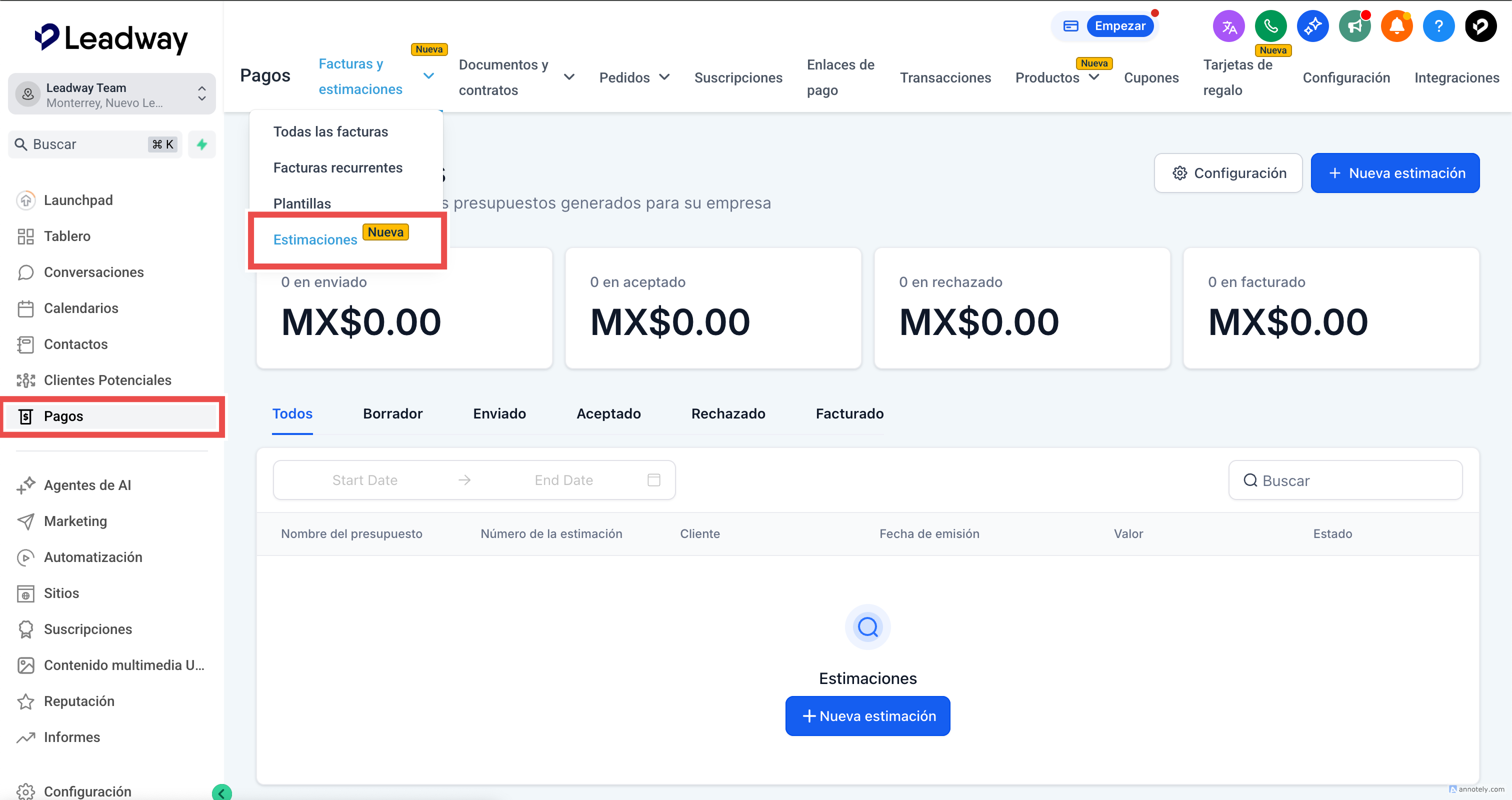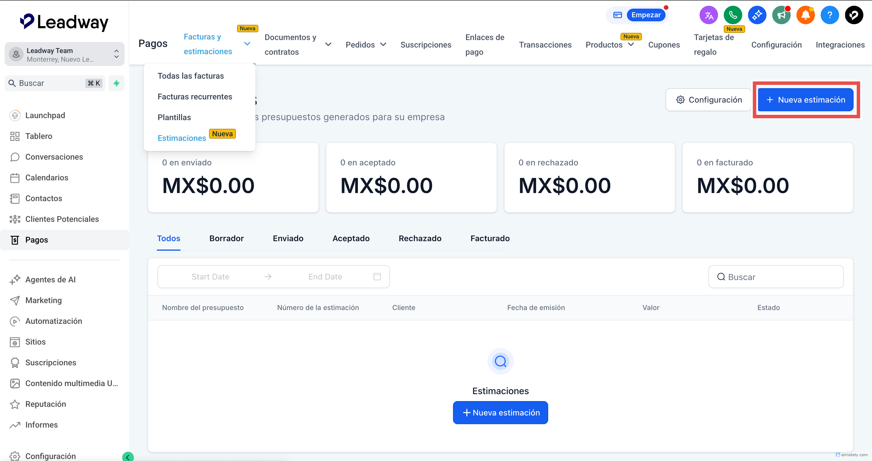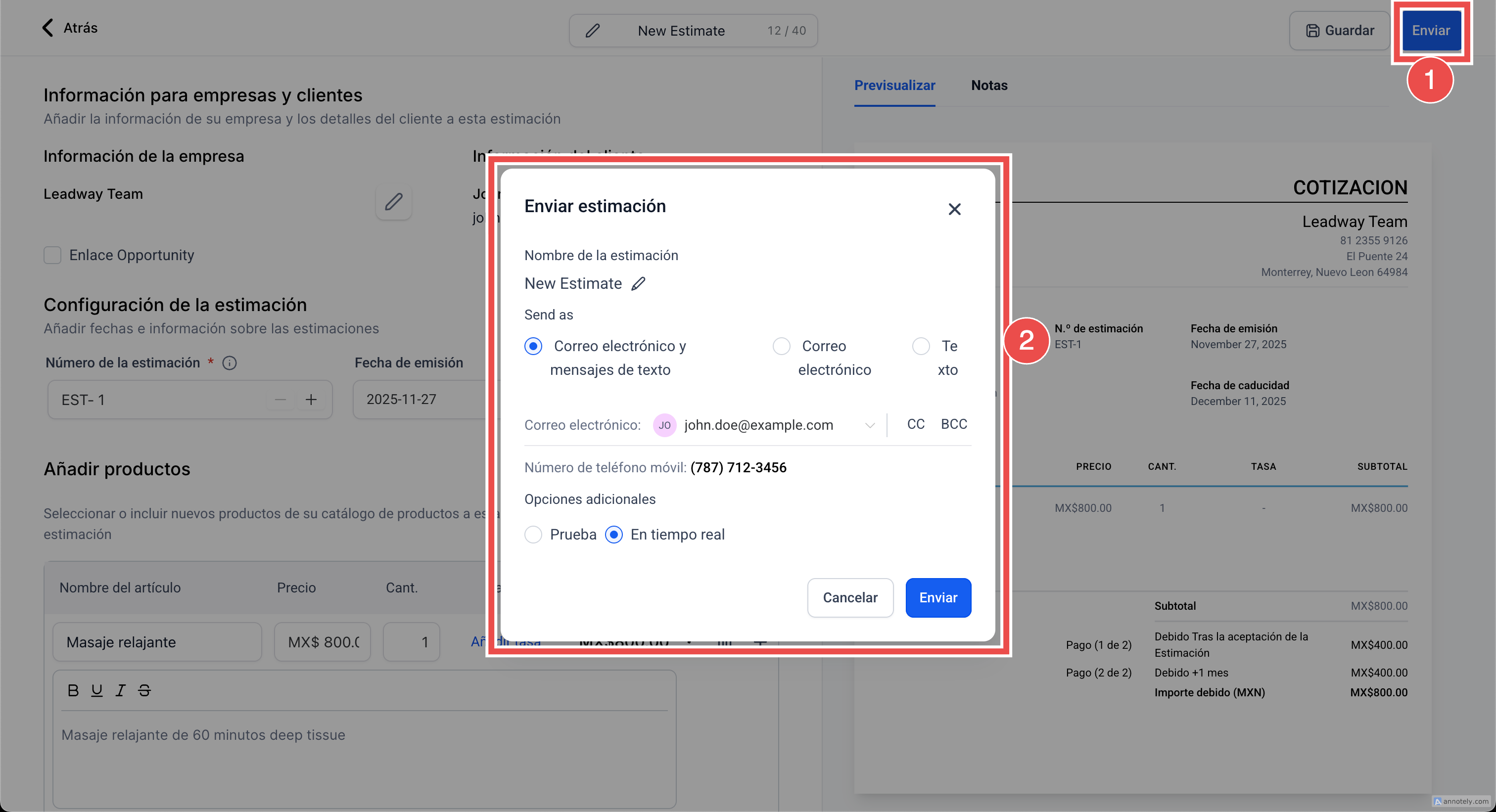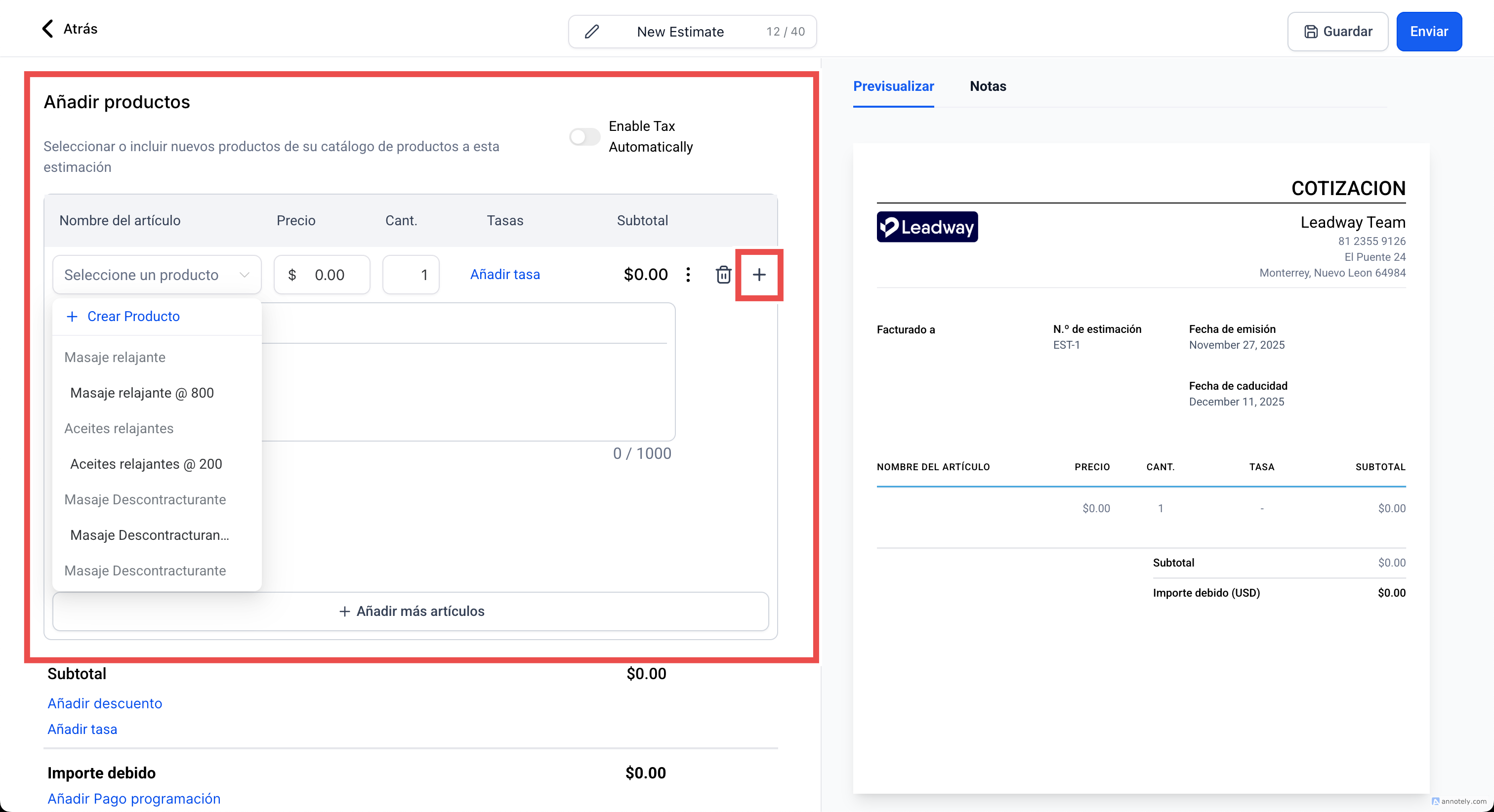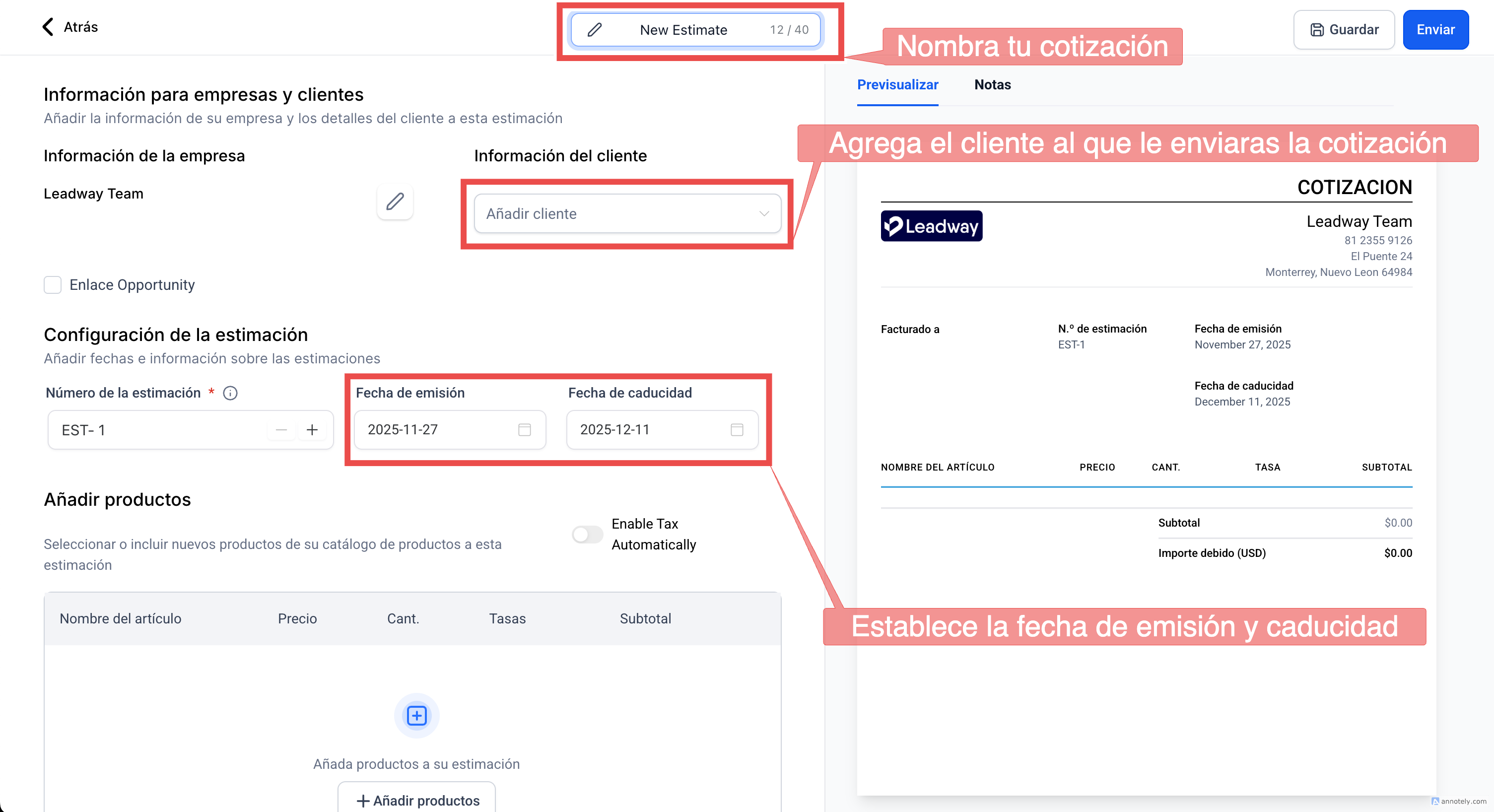 Cómo crear y enviar cotizaciones en Leadway