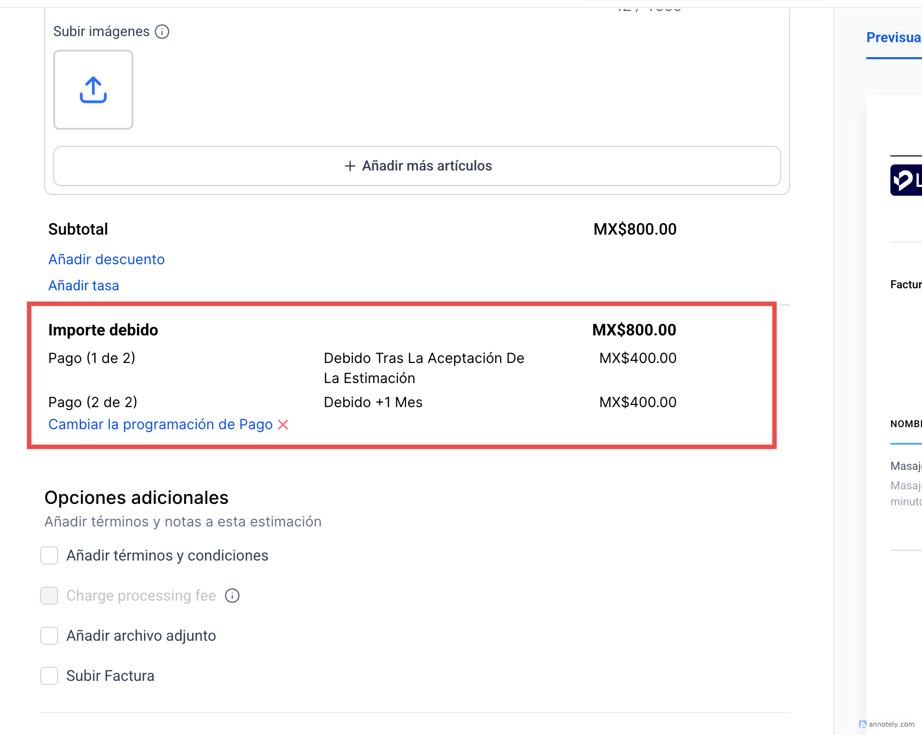 Nota: Puedes agregar descuentos y aplicar tasas como el IVA. También es posible configurar un plan de pagos cuando el cliente da un anticipo. Ahí mismo puedes definir la fecha del primer pago (por ejemplo, 50%) y la fecha del pago restante (50%).
