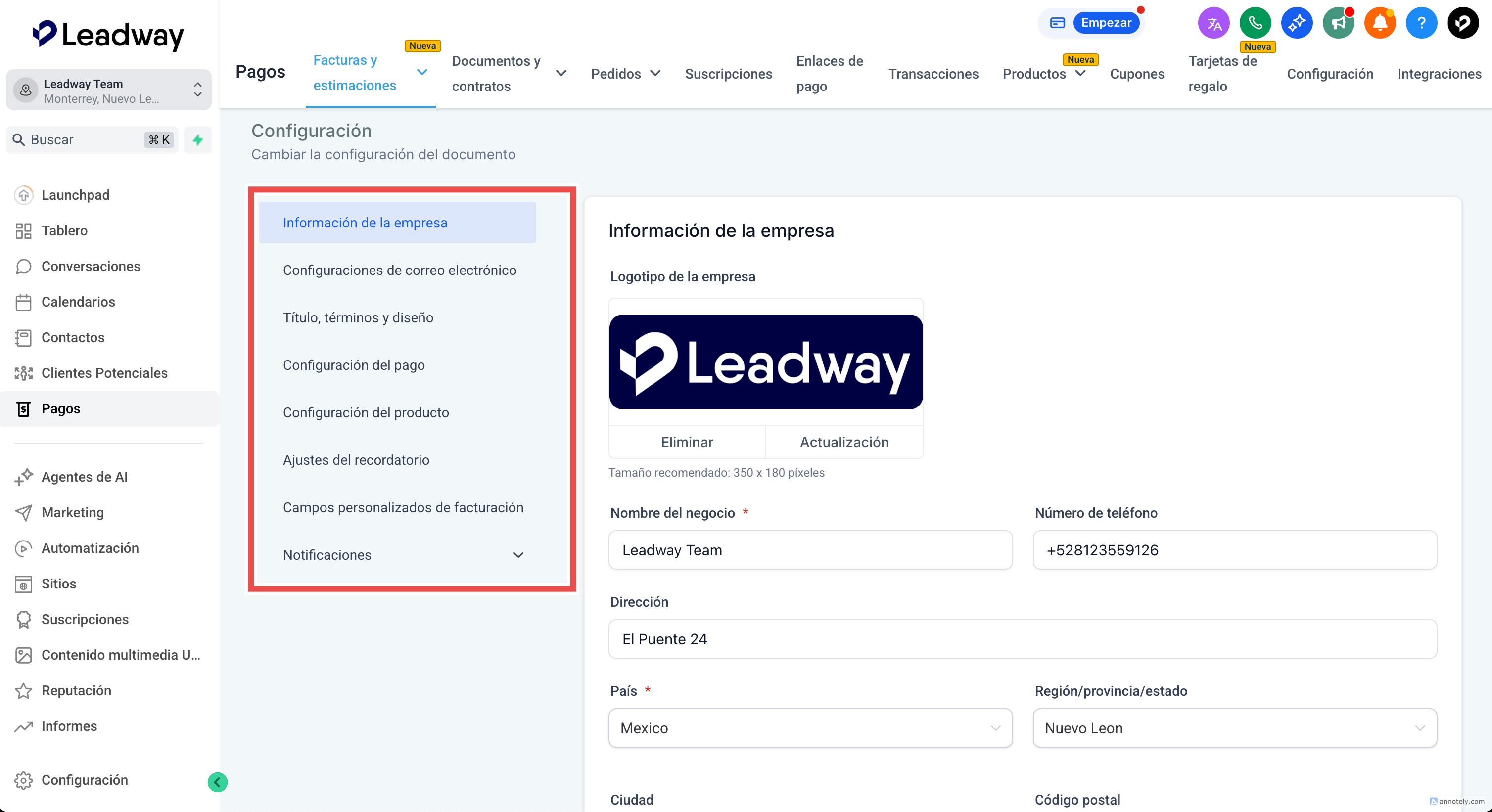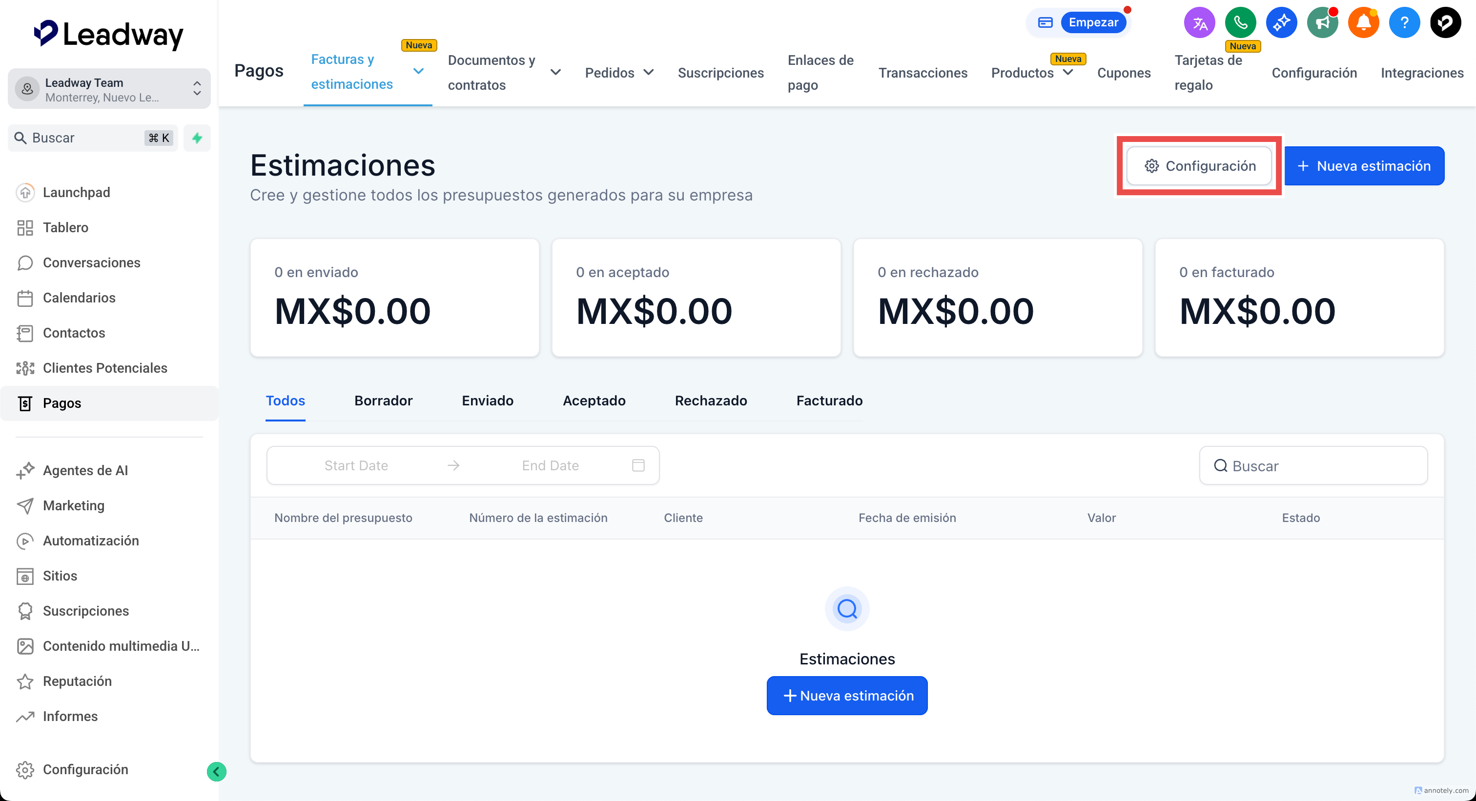 Ingresa a pagos > facturas y estimaciones > estimaciones > configuración