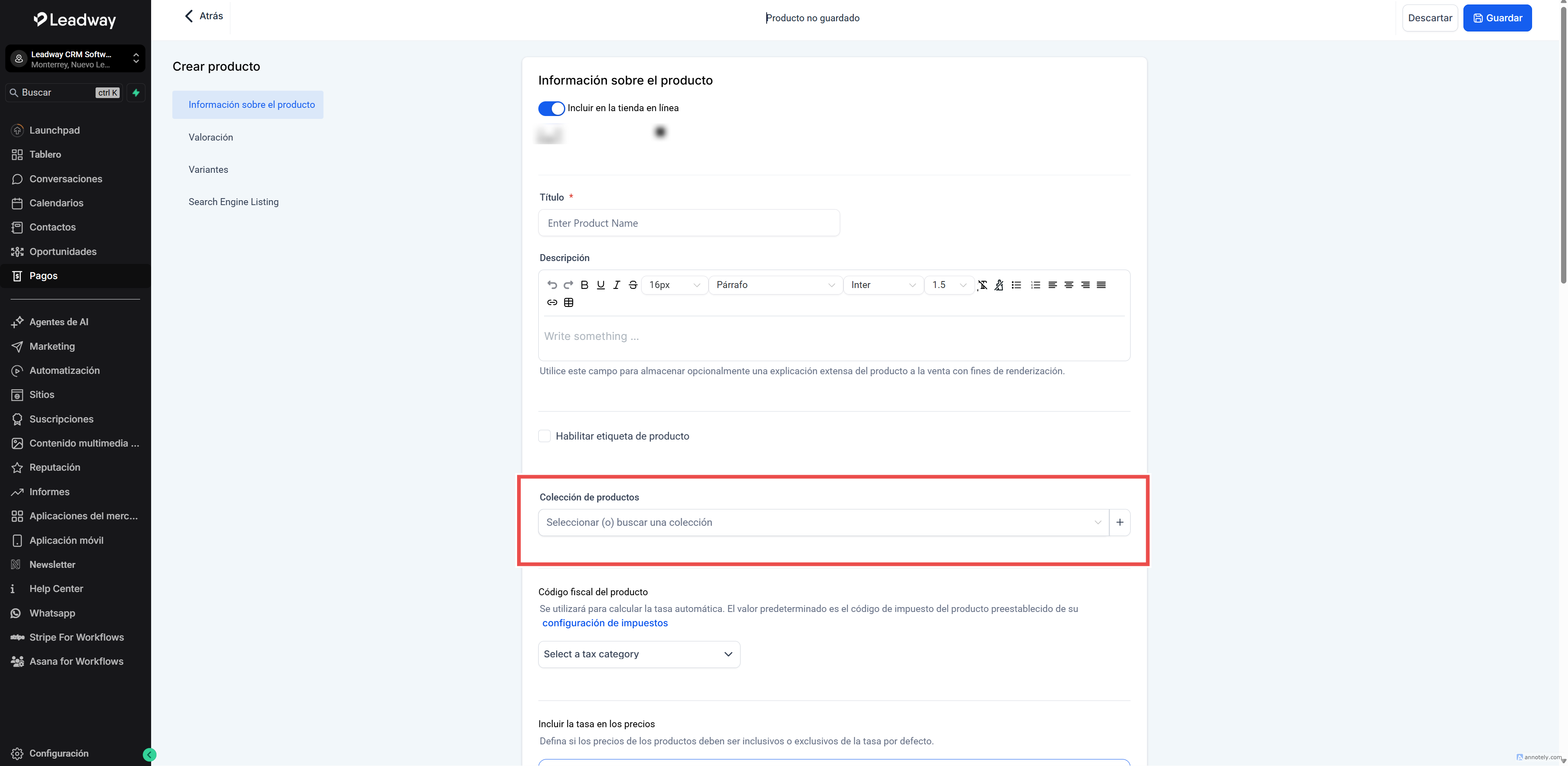 Si deseas que el producto esté disponible para tus clientes, deja esta opción activada.