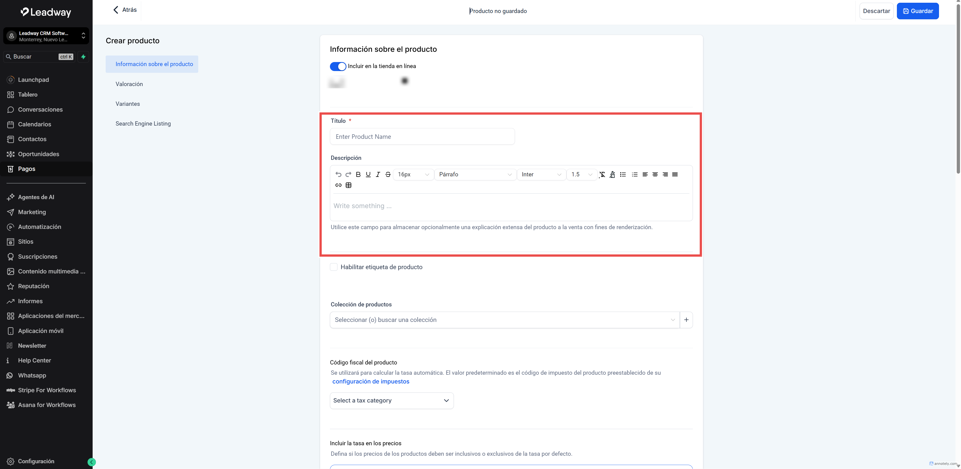 En la sección Información del producto defines los datos principales del artículo que deseas vender.