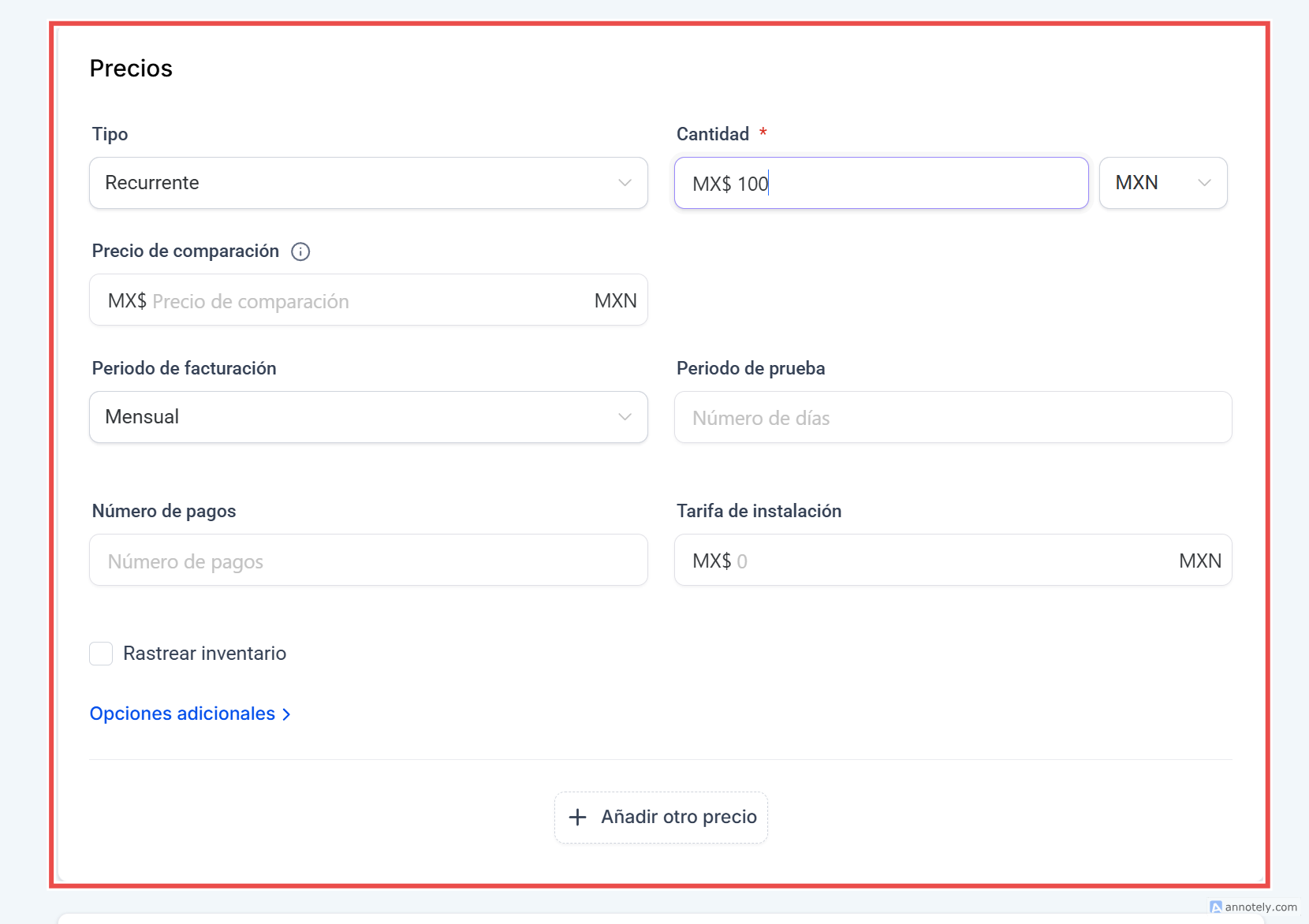 En la sección Precios, defines cómo se ofrecerá tu producto a los clientes. Aquí podrás establecer el tipo de cobro, el monto, la moneda y varias opciones adicionales.