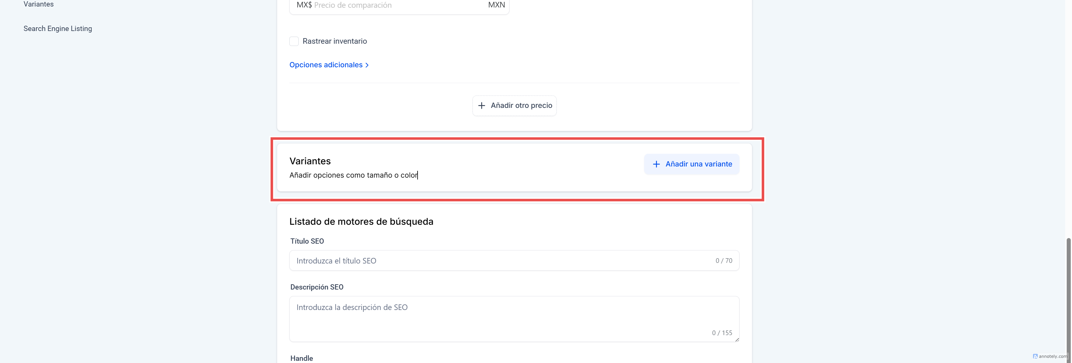 Opcionalmente, puedes agregar un Precio de comparación (Compare-at Price) para mostrar un precio anterior y reflejar un descuento.