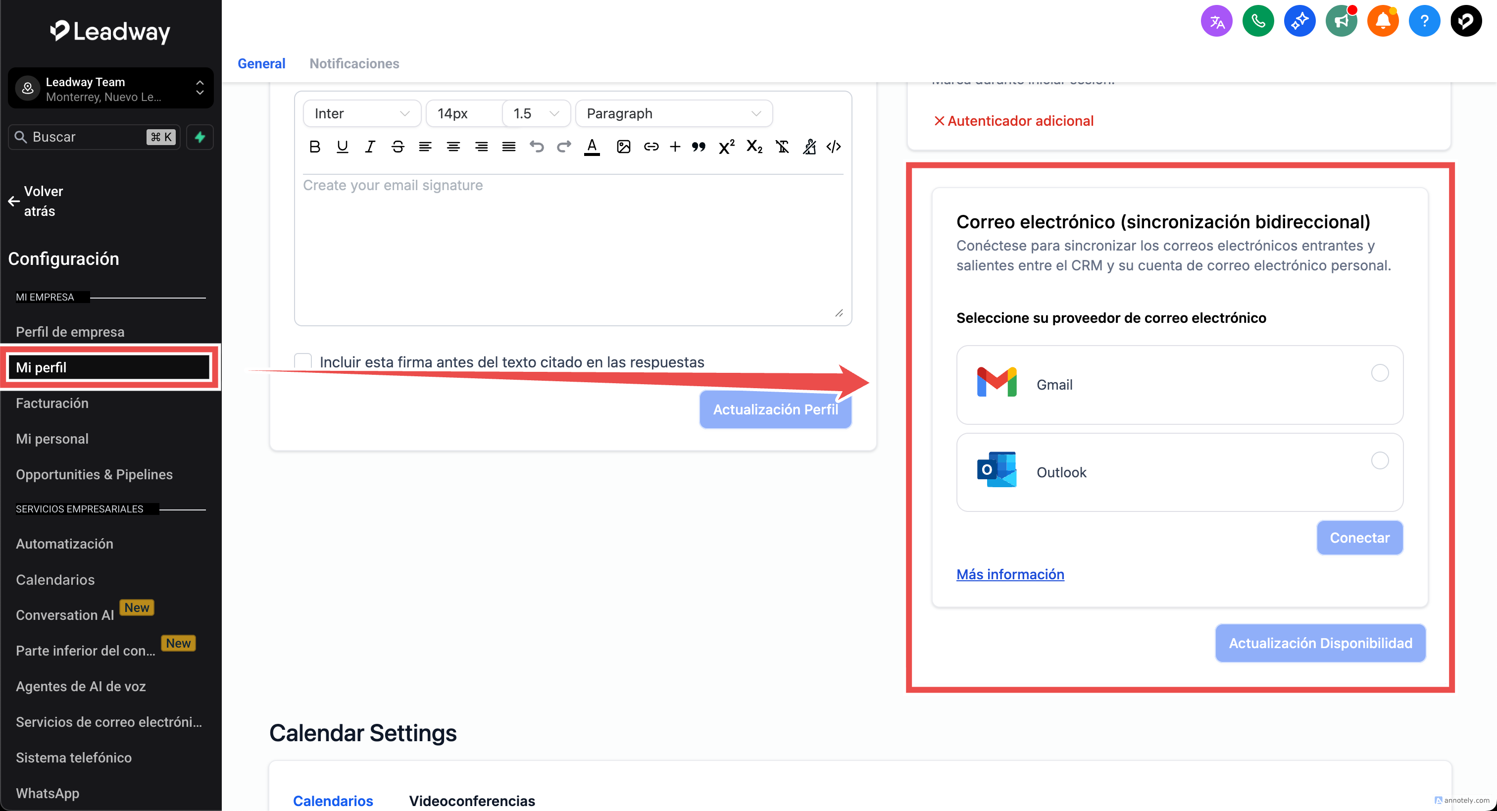 En “Configuración” > “Mi Perfil”, desplázate hacia abajo hasta la sección “Correo electrónico (sincronización bidireccional).” para ver tu correo y su estado de conexión.