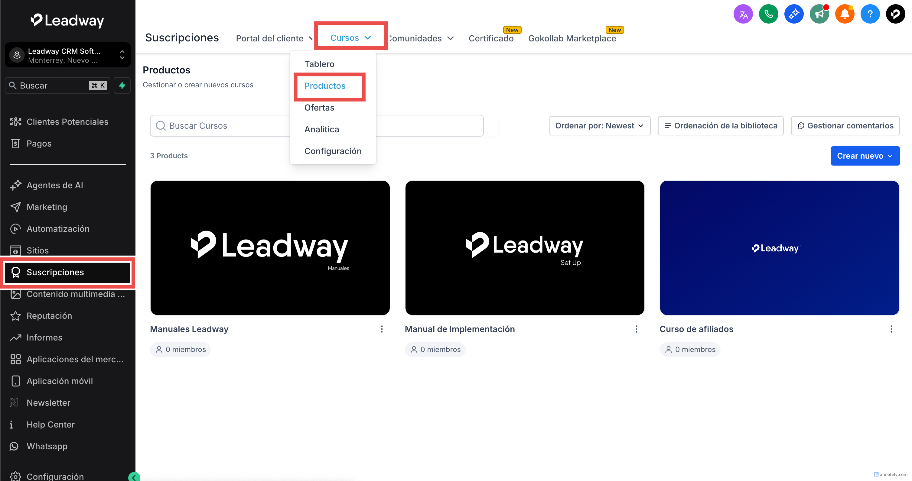 Ve a suscripciones > cursos > productos