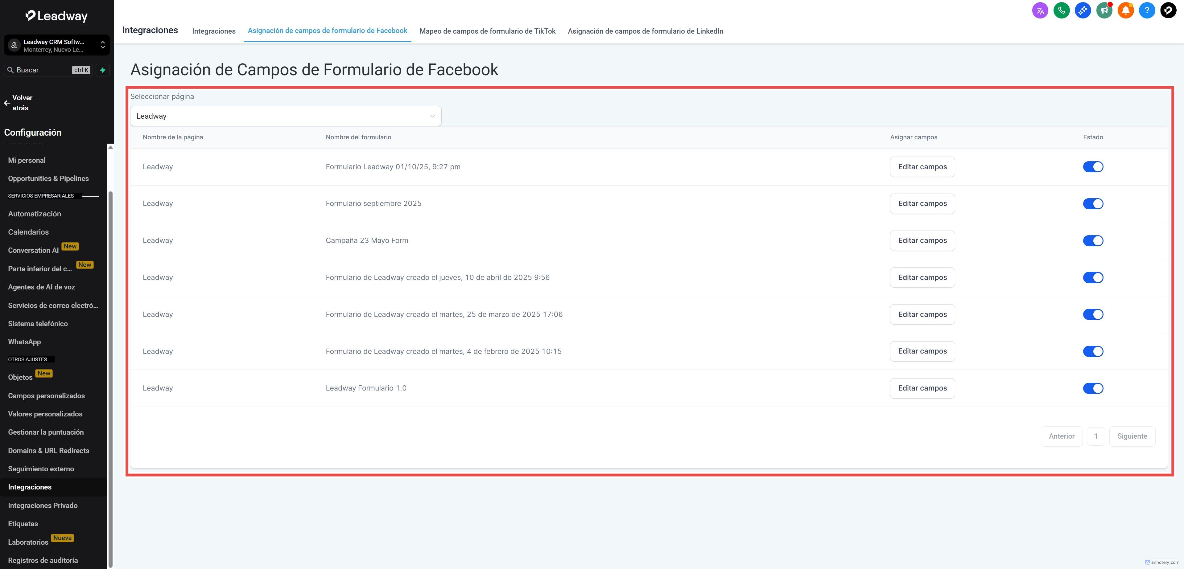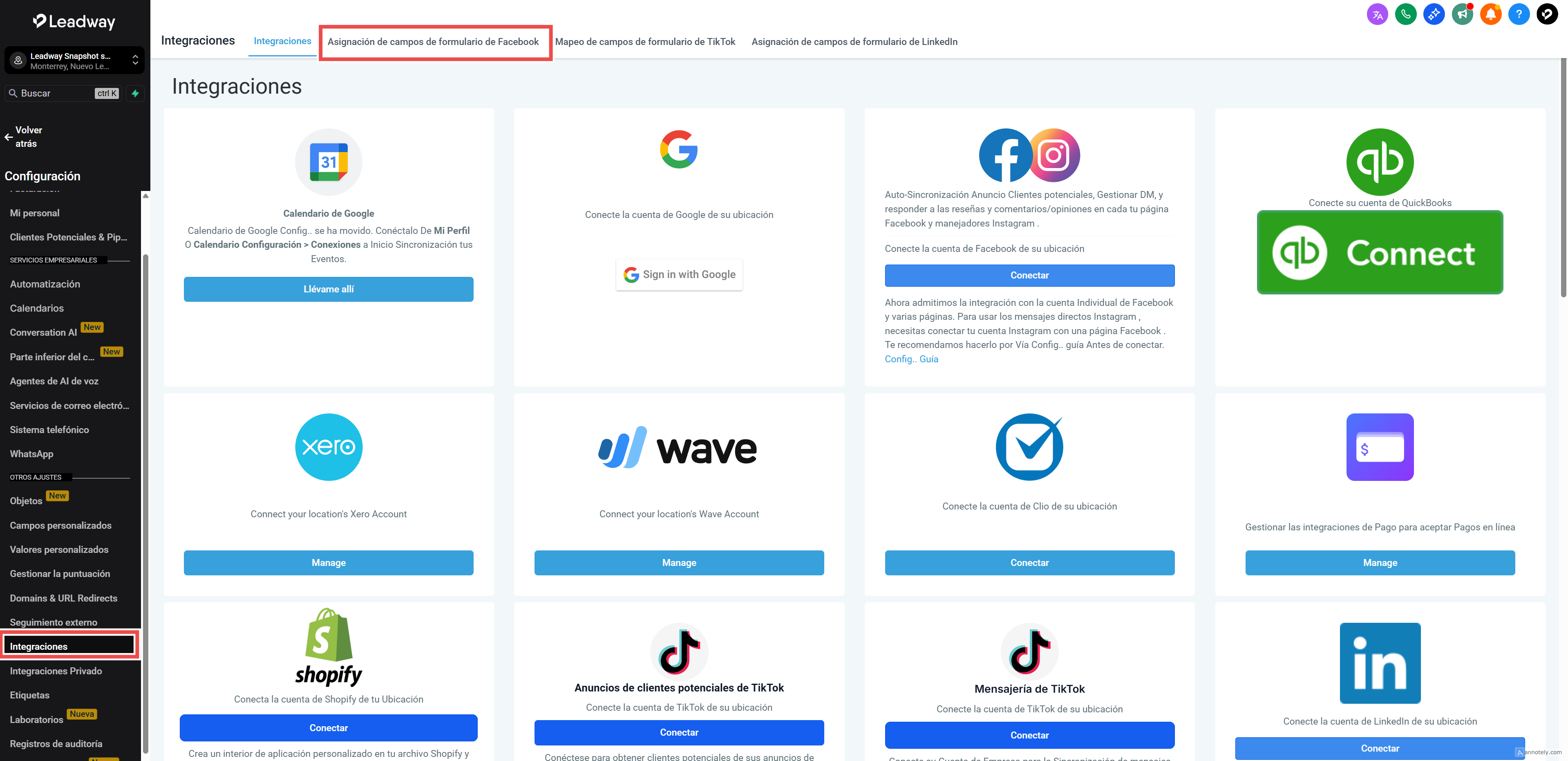 Dentro de tu cuenta, ve a Integraciones > Mapeo de formularios de Facebook.